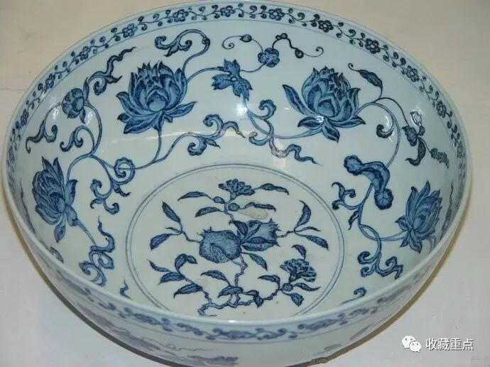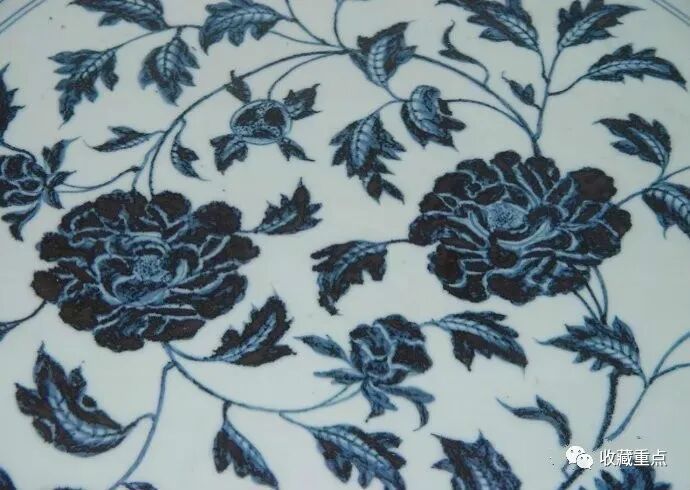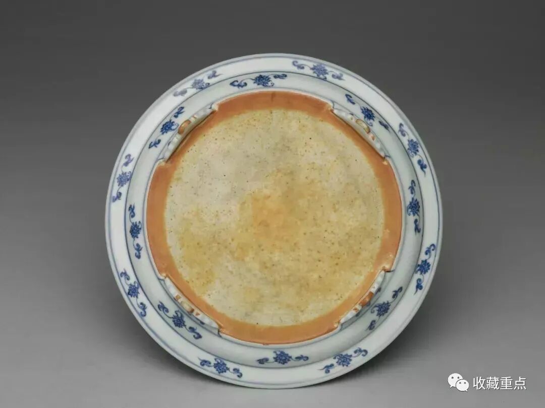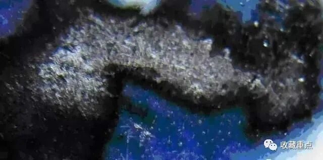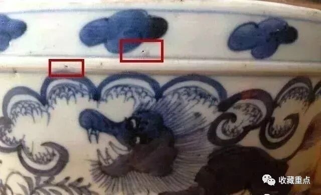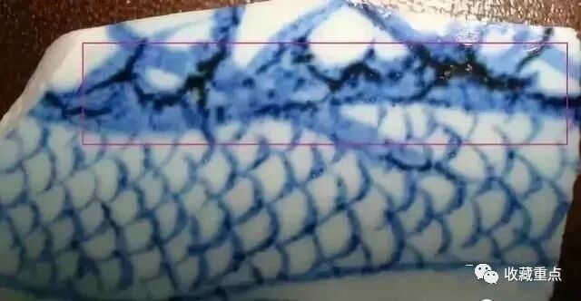 其鉴别方法是手指上沾少量的水一抹,然后用指甲去刮,真假斑痕立判。在上好的青花料上再用笔涂上一条条含铁或铝或锡之类的东西,这种斑痕的呈色有些很白,就是所谓的锡光斑,或者暗暗的,似有似无。![]()
