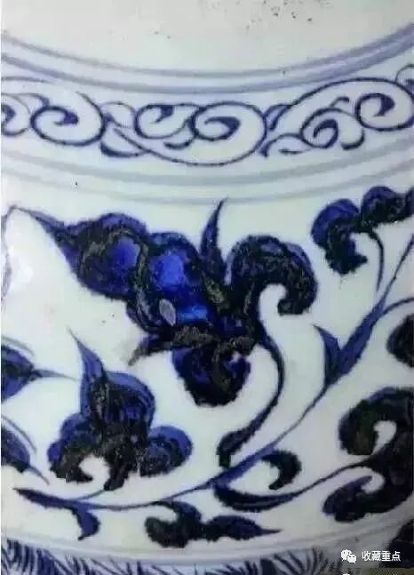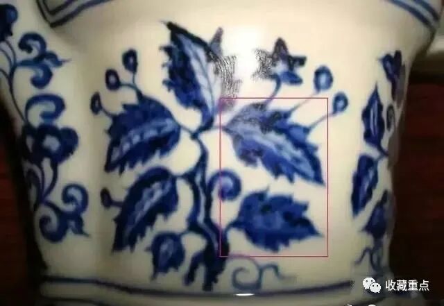 由于这种斑痕是和青料一起上去的,所以也在釉下,是刮不掉的。但是这种方法形成的斑痕是浮在青花上的,原因是烧制过程中氧化铁溶解后慢慢浮起。
