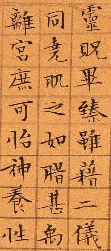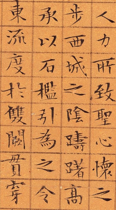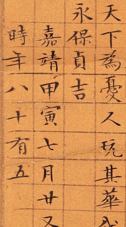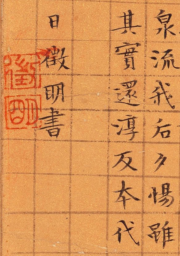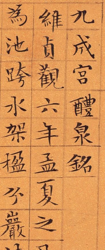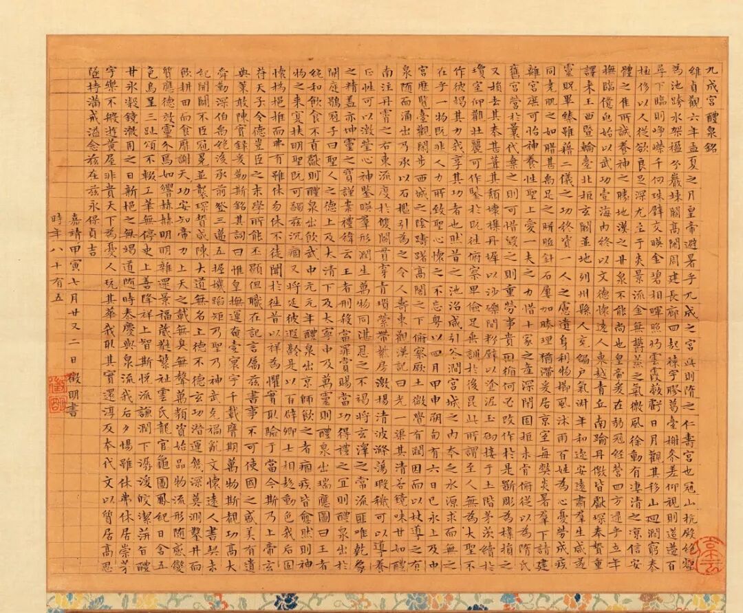 文徵明《九成宫醴泉铭》,楷书,34cmx41.5cm。嘉靖甲寅三月廿又二日,长洲文徵明书于停云馆,时年八十有五。钱泳在《履园丛话》中说:“工书者不精小楷,不能称书家”。而文徵明精于小楷,并且取得了不俗的成就。对此,明代谢古抗称赞说:“古无真正楷书,即钟王所传《荐季直表》、《乐毅论》皆带行笔。洎唐《九成宫》、《多宝塔》等碑,始字画谨严,而偏瘦偏肥之病,犹然不免。至国朝文徵仲先生始极意结构,疏密匀称,位置适宜。如八面观音,色相俱足,于书苑中亦盖代之一人也。”他用“八面观音,色相俱足”来赞许文徵明的小楷书法,虽说有些过誉,然而也可见文徵明小楷的精工。