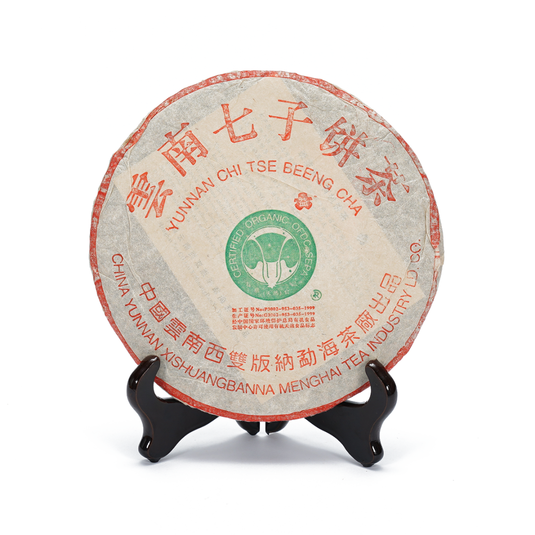 说明:“大白菜”是勐海茶厂选用老班章为原料的定制品,而非常规茶品,生产于2000-2004年,因其外包装上印有绿色食品和有机(天然)食品双认证,标志为白菜图案,故被称为“大白菜”。2002年精品班章,饼型完整紧实,干茶有些许烟味,饼面油润,金毫肥壮突显,里外用料一致。汤色金黄油亮,茶气强烈,饱满丰富,浓香醇厚,木香烟香味独特,喉韵十足且悠长,生津回甘强烈持久。随着时光的推移,茶韵变化也越发出众,堪称班章普洱的代表作。