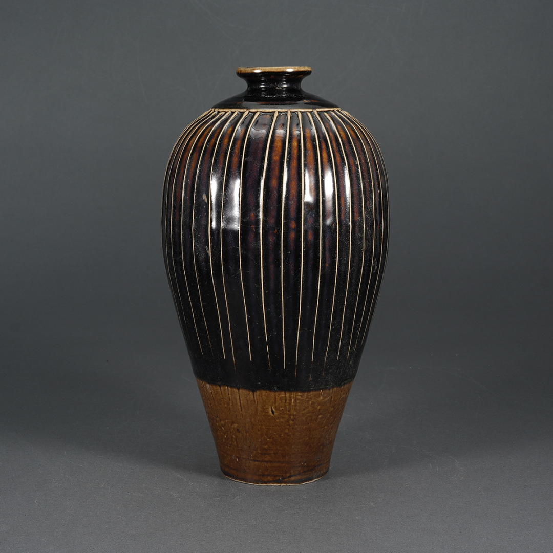 说明:磁州窑器物质朴清新,其各类装饰工艺丰富多彩,争丽斗艳。此件黑釉线条梅瓶轮廓线优美,造型周正挺拔,通体满施釉,止于器足,器底露胎。梅瓶外壁以线条纹饰表现出黑白相间的流畅与自然,饶有趣味。如果说花团锦簇的青花梅瓶犹如意气风发的锦衣阔少,朴实大方的黑釉梅瓶则恰如含蓄自若的清雅文士,更显高古的气息。