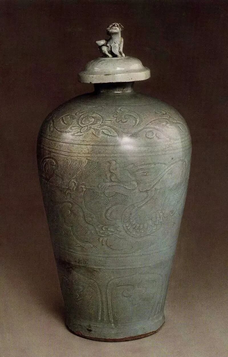 元前期景德镇窑青白瓷刻划花水龙纹带盖梅瓶,通高33厘米,江西万年县石镇公社元泰定元年(1324)汤顺甫墓出土