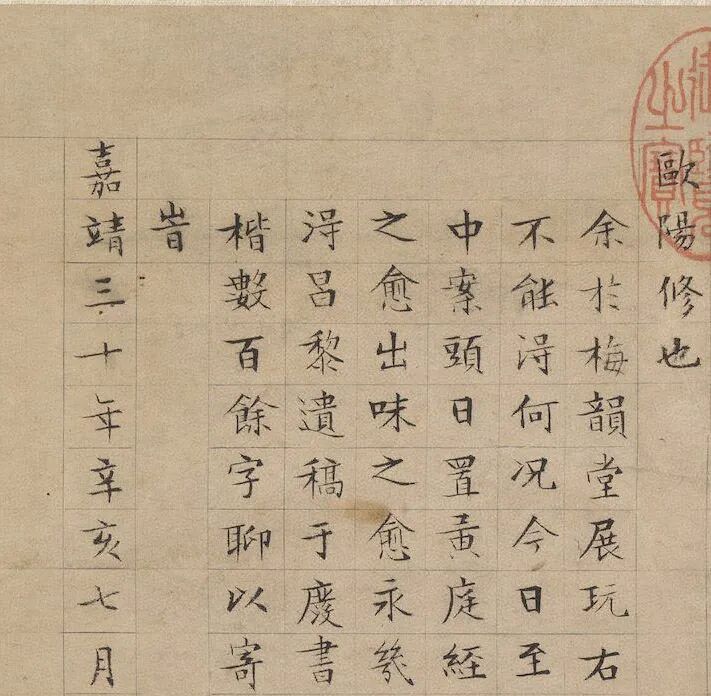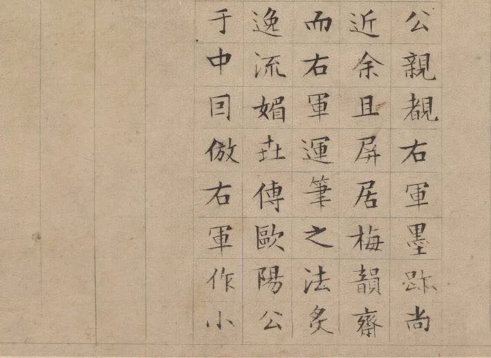 细看之下,文徵明这件书迹虽然说是学黄庭经笔法,却显露出欧阳询那种结体严密,笔画劲健的风格。由此可以看出,文徵明是透过欧阳询再追溯王羲之的笔法。