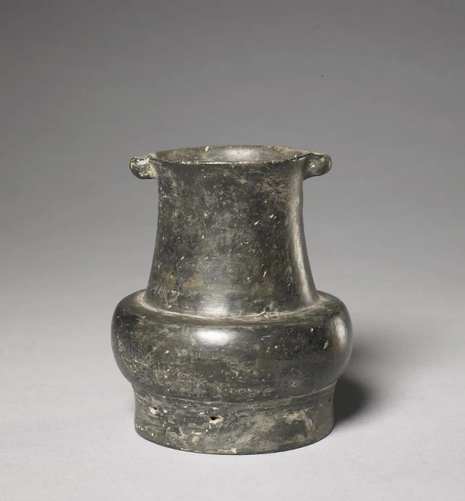 黑陶双系壶,此器物高11.5厘米,口径6.5厘米,足径8.2厘米。壶口微外撇,口沿两边置双系。下部渐广,至肩凸起,扁腹,长颈。足上镂有八个小孔。底外凸。造型规整,胎薄体轻,表面经过打磨,光泽可鉴。