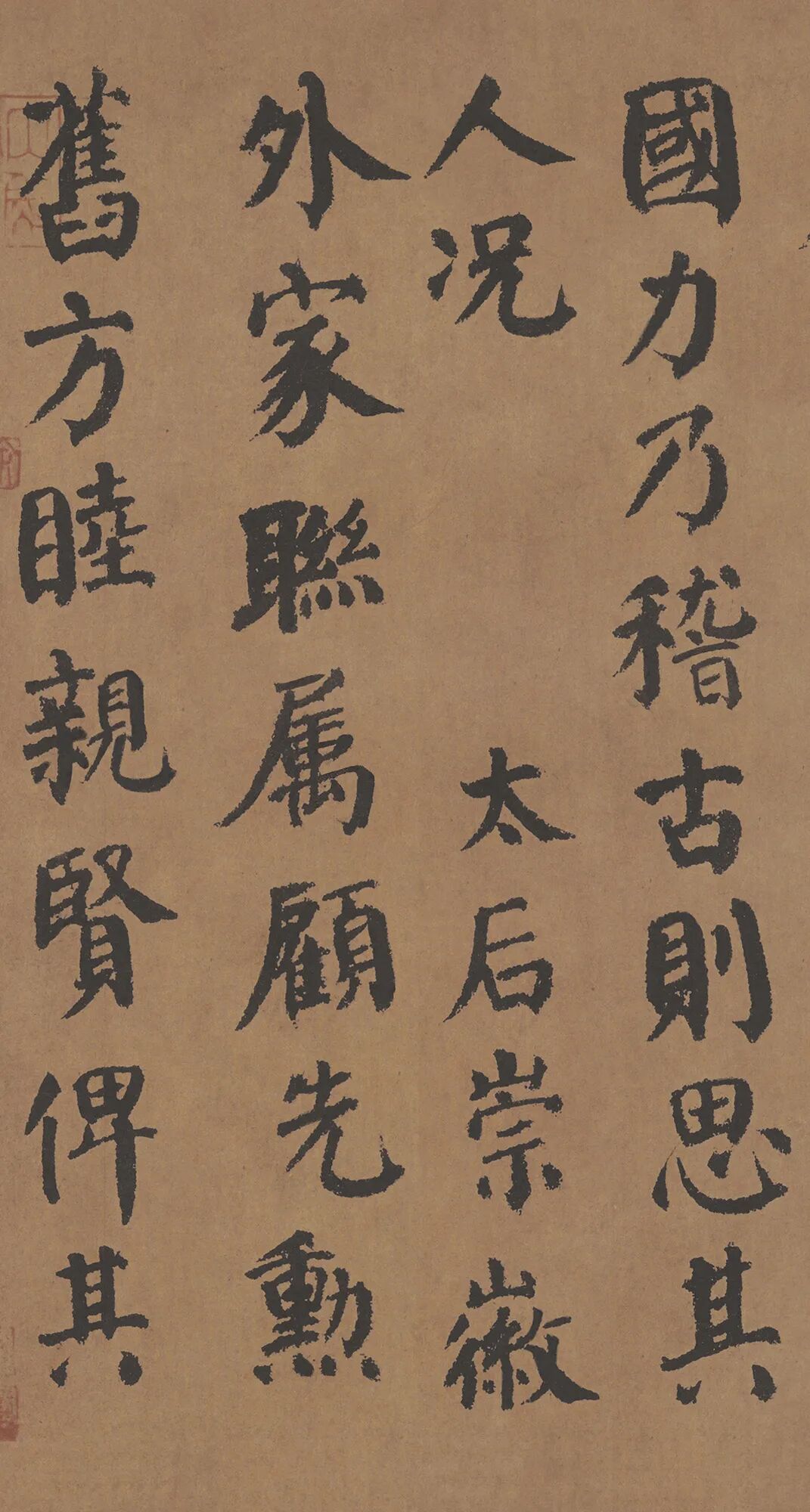 在用笔上,此作丰肥古劲,寓巧于拙,字体多是藏锋下笔。在点画上偏于圆,除横细竖粗的特点之外,有些竖笔,中间微微向外弯曲,因此显得骨肉亭宏,沉雄博大,这就是颜氏书法的魅力。