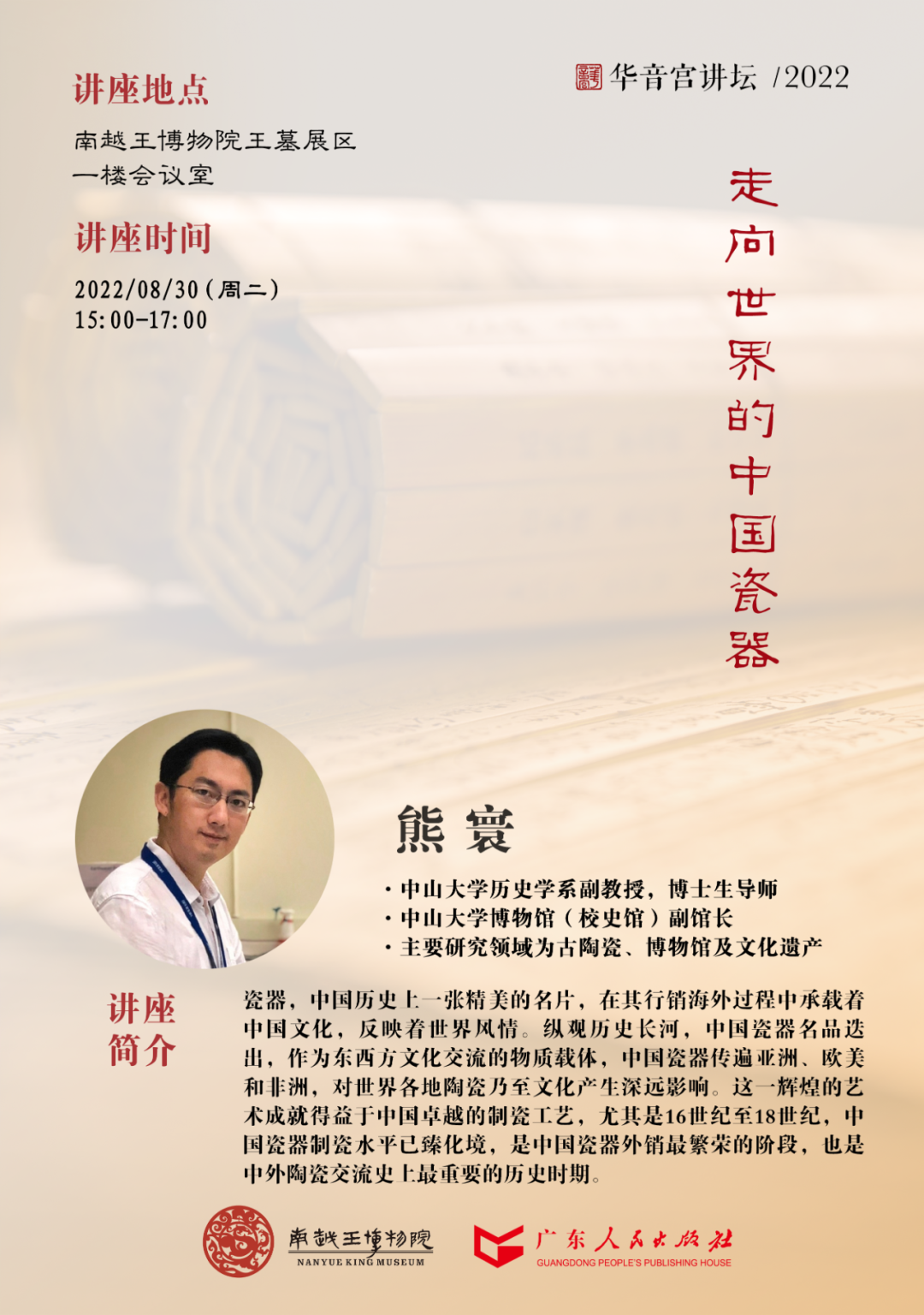 华音宫讲坛邀请到熊寰副教授以“走向世界的中国瓷器”为主题举行讲座,本次讲座将以线下讲座和线上直播的形式对公众开放。8月30日(周二)下午三点,诚邀各位观众积极报名、现场参与,或在“南越王博物院”官方微博、B站、视频号等线上渠道参与此次讲座。先来了解一下此次讲座的主要内容: