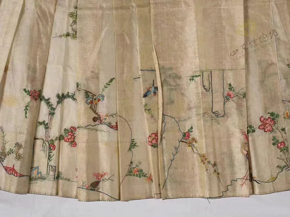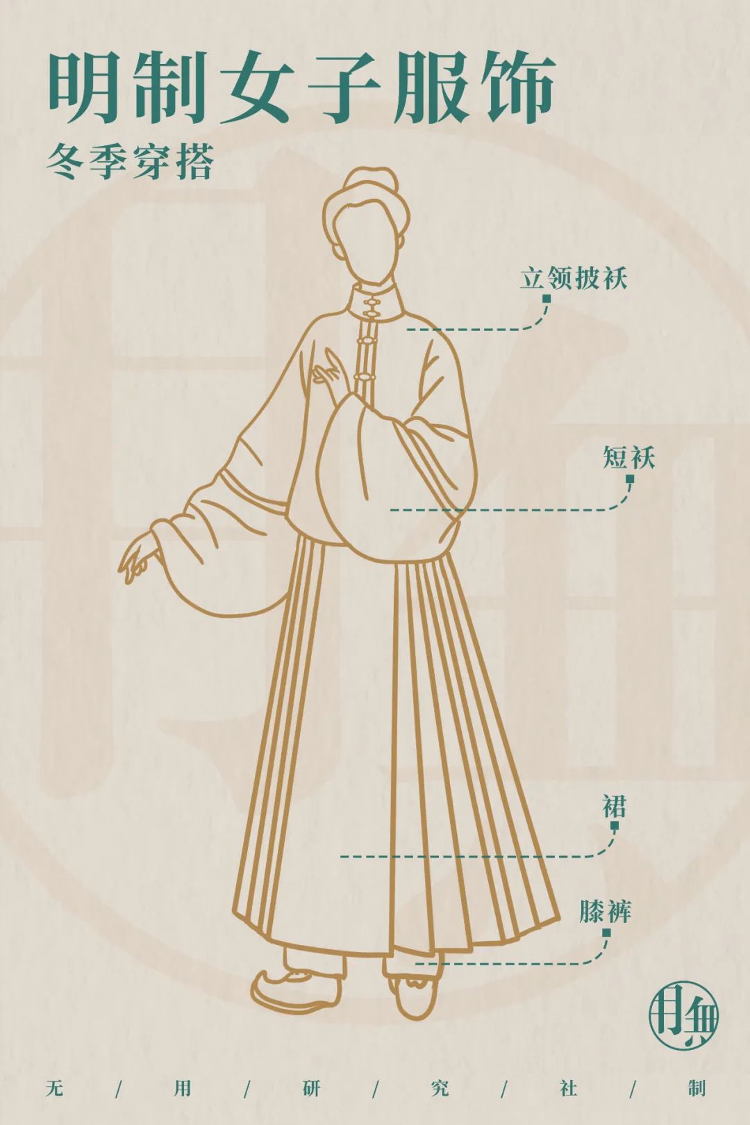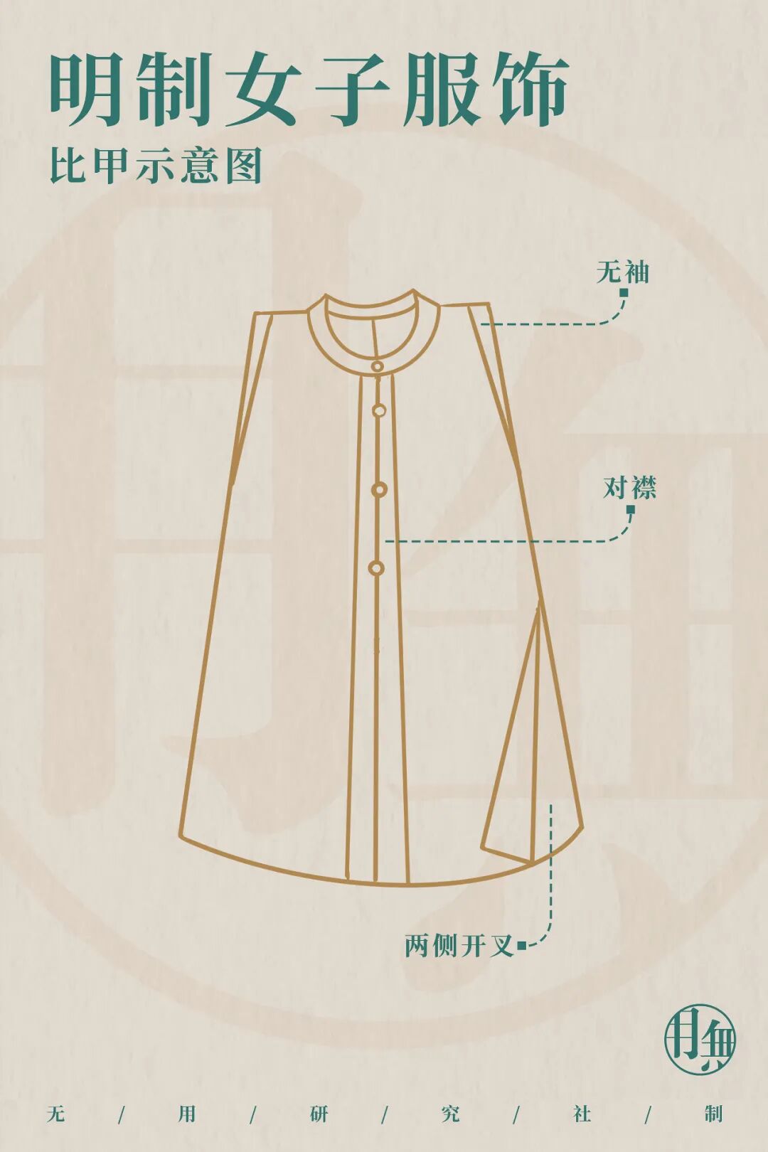 衣襟是服装的重要组成部分,除了防寒保暖的实用作用,一个恰到好处的衣领能够成为带来非常美观的视觉效果。在中国传统服饰文化中,衣领结构占据了非常重要的位置,领子结构通常制约着衣襟的形制,在漫长的历史发展中,渐渐形成了中式特色的领襟形制。简单来说,就是正面看过去有一个光面(不打褶)而两侧打褶的裙子。马面裙前后里外共有四个裙门,两两重合,前后对称,外裙门有纹饰,往往采用寓意丰富的吉祥图案,官宦之家则更加讲究的龙纹、云蟒纹等,显示着身份的高贵同时表达着平安喜乐。马面并非大家认为的“牛头马面”的那个意思,文献中最初对“马面”的记载,是在《明宫史》中:“曳撒,其制后襟不断,而两傍有摆,前襟两截,而下有马面褶,往两旁起。”其实还有一种说法,“马面”是来自于建筑学的词汇,指的是一种古代防御的建筑结构,也称“台城”。是每隔一定的距离就有突出的矩形墩台,利于防守者从侧面攻击来袭的敌人,形成包夹之势。远远地望着马面裙,裙身正面与两侧的打褶结合,的确和马面的建筑结构非常相像,至于何时何故建筑上的词汇与服饰相关联,那就暂时不得而知了。说起马面裙的历史,那就可以追溯到宋朝的一种名为“旋裙”的裙子,旋裙是宋代女子为方便骑驴而设计的一种功能性裙子,其特点是前后开胯,以便乘骑。作为火遍大江南北的马面裙,上至一国之母下至黎民百姓,人人皆穿马面裙,只是根据不同的阶级,马面裙在的质地、装饰和色彩上有所区别。纹饰多样的马面裙且寓意丰富,绣上龙凤纹样,象征吉祥和美好姻缘;绣上植物纹样,牡丹代表富贵、菊花代表益寿延年……典雅而华丽的马面裙不仅美,更胜在其文化内涵。对于中国古代服饰,不少人有“天热穿唐宋服饰,天冷穿明朝服饰”这么一个印象。对此很多人就有了疑问,古代的服饰怎么还和冷暖有关系?那某一个朝代其他季节穿什么?“天热穿唐宋服饰,天冷穿明朝服饰”其实是一种错误的固化印象。产生这种印象的原因或许在于影视剧,明代服饰的衣领无论是立领还是交领,包裹脖子的部分都比其他朝代更多一些,在影视剧中直观印象会造成一种简单粗暴的想法,那就是认为高领就是冬装。对于明代服饰为何包裹如此之严,也有人提出“小冰河期”的观点,其实小冰河期的集中表现是较多的极端天气,不仅冬天异常寒冷,在夏天也更热于往常。况且小冰河期并非伴随整个明朝,其主要时间在明末清初。事实上,古代服饰对现代人来说都有一些“裹太多”,这是衣着习惯,并未明代独有。即使看起来是包裹的严严实实,使用不同材质面料制作,在夏季穿依然可以清凉薄透。反之,看起来轻薄的衣服,在夹衣里添置棉花、内衬等,也会起到保暖的效果。在夏季的私密场合里,明代女子的穿着还是很凉爽的,上半身单独穿一件抹胸,外面套一件轻薄的汗衫,或者舍弃抹胸仅着纱衫也可以。不过相比之下,下半身装束较为保守,小衣、裤、裙都还会整齐穿戴。●内衣:内衣在明代被称之为“主腰”、“抹胸”,其材质主要为纱、绫、罗等织物,明代主腰最常见的形制一种是制成与胸围相等、长至腰腹的横幅,然后围在胸部,开口向前或者向后,开口处缀有一排钮扣或者系带作为固定之用。还有一种是类似现代背心的形制,系带收紧后还有收腰的效果,在徐蕃夫妇墓中就出土了这样一种主腰。●汗衫:“汗衫”最初被称作“中衣”和“中单”,是一种用纱与绢制成的衣物。相传汗衫之名,据说始于刘邦,据《事物纪原》中记载:“汉高祖与项羽战,汗透中单,遂有汗衫之名。”即是说刘邦在一次交战后,回到营地,发现自己的内衣已经全部被汗水湿透,于是他笑称内衣为"汗衫"炎炎夏日,居家时只着一件"汗衫",清凉舒适。倘若需要外出,还需要再套上一件外衣,夏日的外衣轻薄透明,但有了"汗衫"的存在,遮盖住抹胸,倒也不失了礼制。一般作为内穿的裤子都比裙子稍短,在裤外套一双膝裤,刚好衔接住裙摆和鞋子的距离,膝裤不仅可以遮住过干简朴的袜子,而且装饰上流行的纹样,更显得精致秀气。穿着方式为先穿裤,再把膝裤扎在裤外的膝下,最后再将裙系在裤外。即使是夏日,也免不了需要外出的时候,在公共场合定是要好好梳妆打扮,更换穿搭了,此时的大明的女子打开衣柜,她会选择穿什么呢?●衫:用纱制成的衫轻薄清爽,夏日里穿上透气的短衫,再配以长裙,就是经典的上衣下裙的显高穿搭。到了明中后期,女衫的长度渐渐和男装一致,时兴的女式长衫温婉素净、清新淡雅,成为女子衣柜中必不可少的单品。比甲之名始自元代,明代沈德符《万历野获编》 卷十四:“元世祖后察必宏吉剌氏创制一衣,前有裳 无衽,后长倍于前,亦无领袖,缀以两襻,名曰比甲。”实际上它与隋唐时期的半臂、宋朝背心有着一定的渊源关系,由此发展而来。