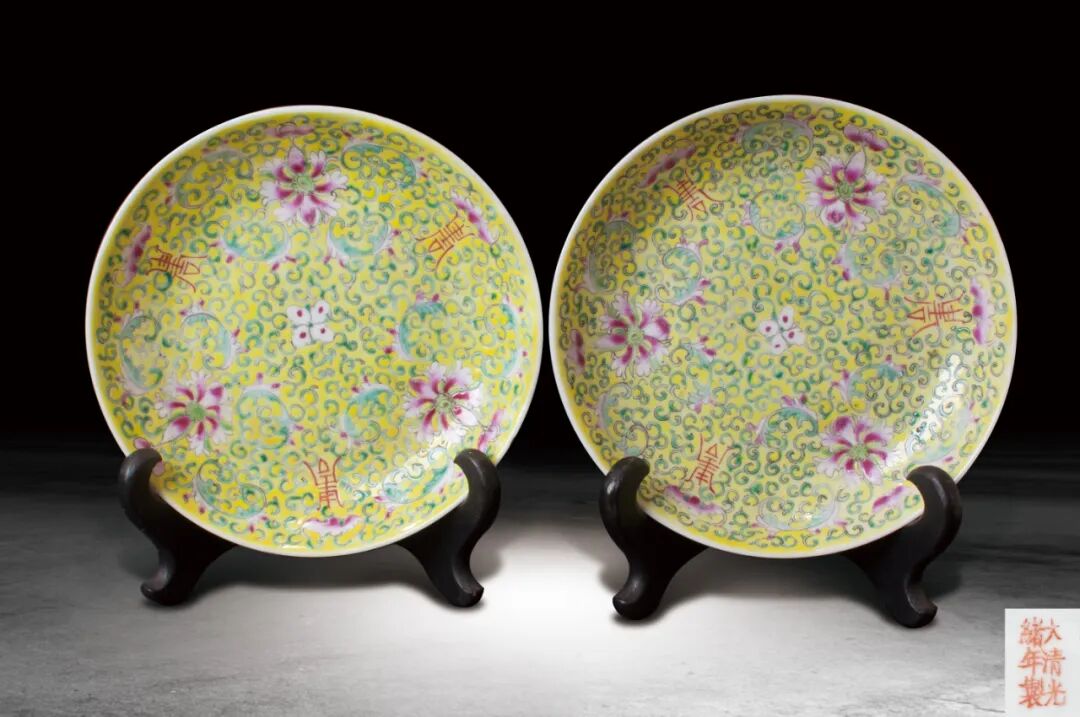 39 清 黃地粉彩福壽紋碟一對