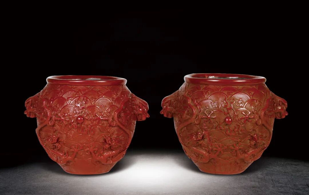 185 漆器雙鋪首龍紋罐一對