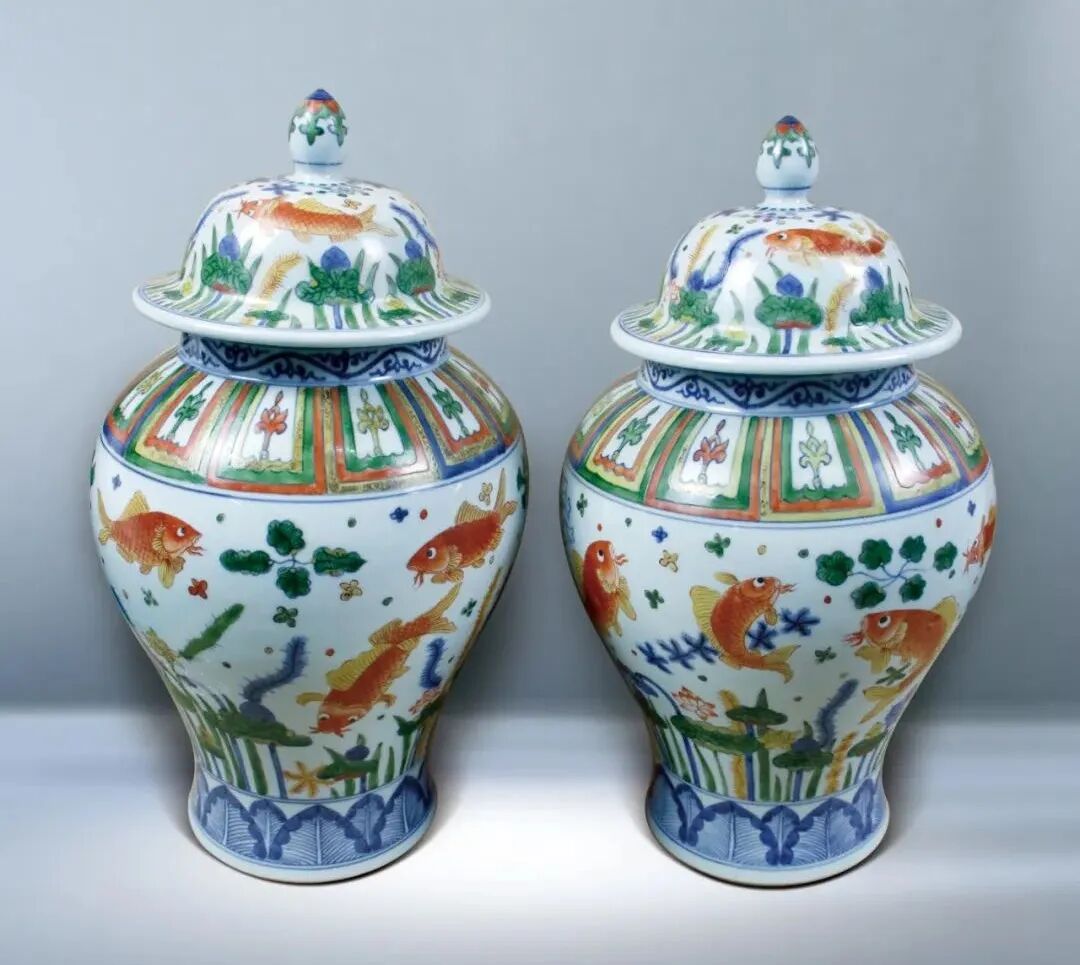33 五彩魚藻紋罐一對