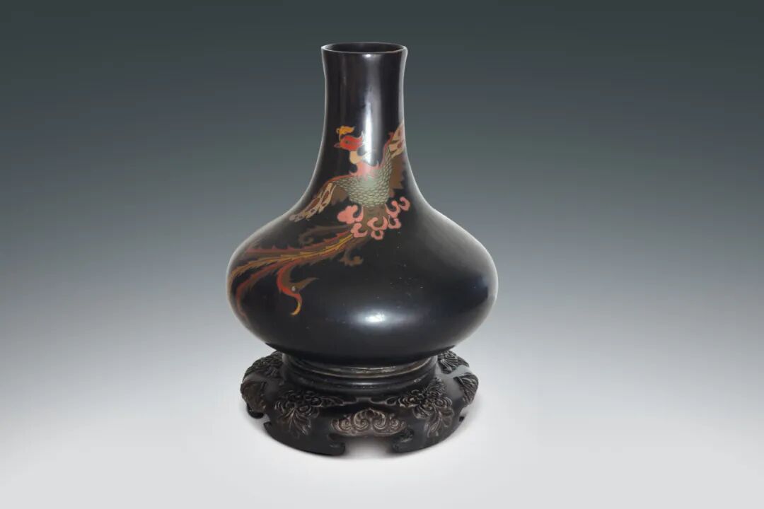 155 清 木胎黑漆加彩鳳紋瓶