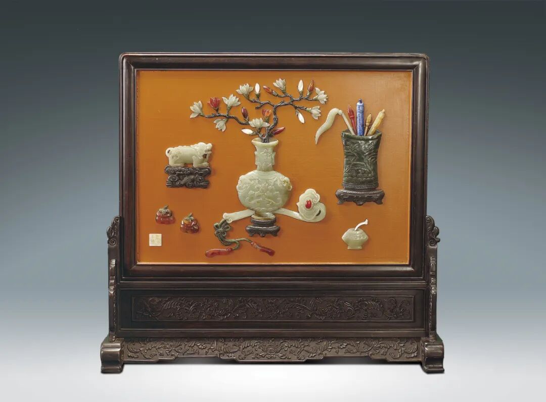 173 紫檀鑲八寶清供紋背青綠山水插屏