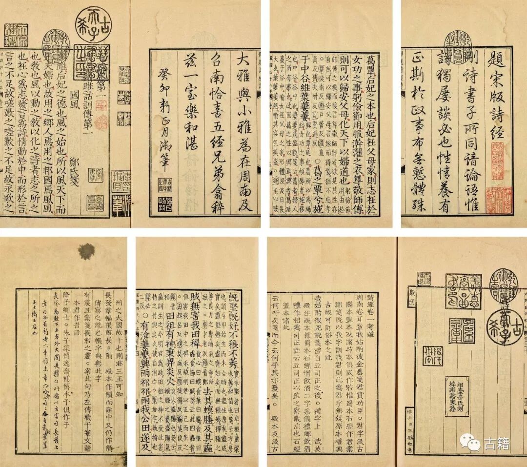 高宗《五经萃室记》云:“至于收藏家,则《易》、《书》、《诗》盖同经七八家而略有异,(《易》、《书》、《诗》三经皆有晋府书画之印及徐乾学、季振宜、陈定书、李国寿、陈氏世宝、敬德堂诸印,《尚书》又有覃怀李氏印,盖大同小异云。)藏《礼记》者四家,(晋府书画印、李国寿印、覃怀李氏印、敬德堂图书印。)藏《春秋》者三家。(宋本印、项氏万卷楼图籍印、季振宜印。)”现据乾隆武英殿翻刻岳本五经所摹藏印及《天禄琳琅书目后编》所载《论语》、《孝经》、《孟子》三书藏印,略考诸经流传情况如下。