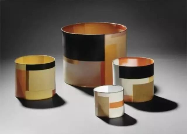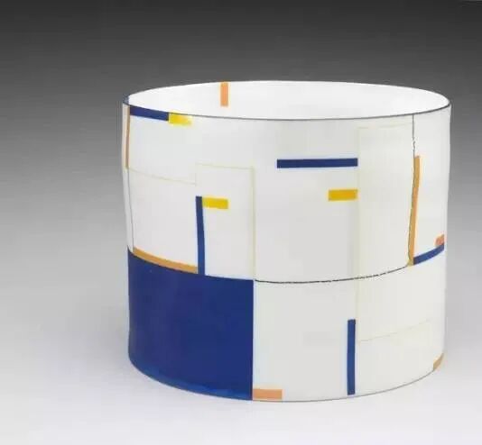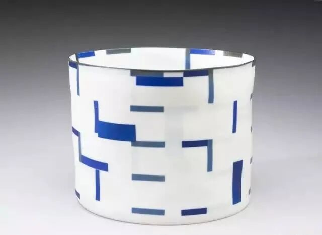 丹麦陶瓷艺术家Bodil Manz 于1943年出生于哥本哈根,在当代欧洲陶艺薄胎瓷领域有着重要影响。她在圆柱体的内外面用几何图案装饰,从而让陶瓷器皿更像是立体的现代派绘画作品。Bodil的器皿多为圆柱体造型,注浆成型,器表饰有形式感强烈的几何图形。几何图形的装饰采用贴画纸转印工艺。这一方面是技术的要求,另一方面,在技术的背后则是审美的需要。