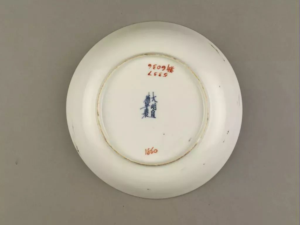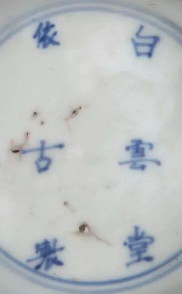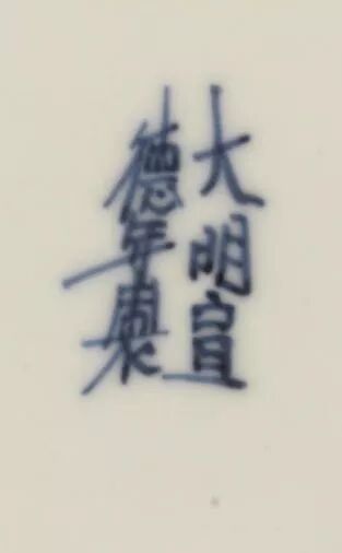外底署青花楷体“大明宣德年制”六字双行款,字体显得潦草,与宣德本朝年款写法相去甚远。![]()