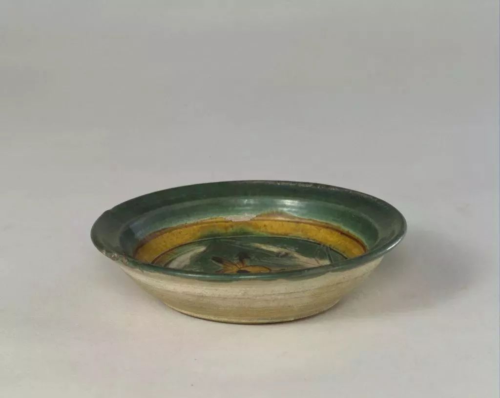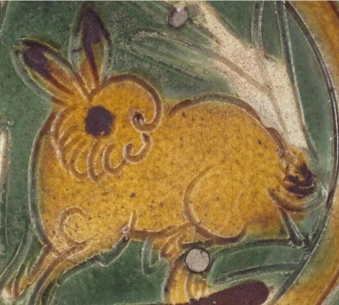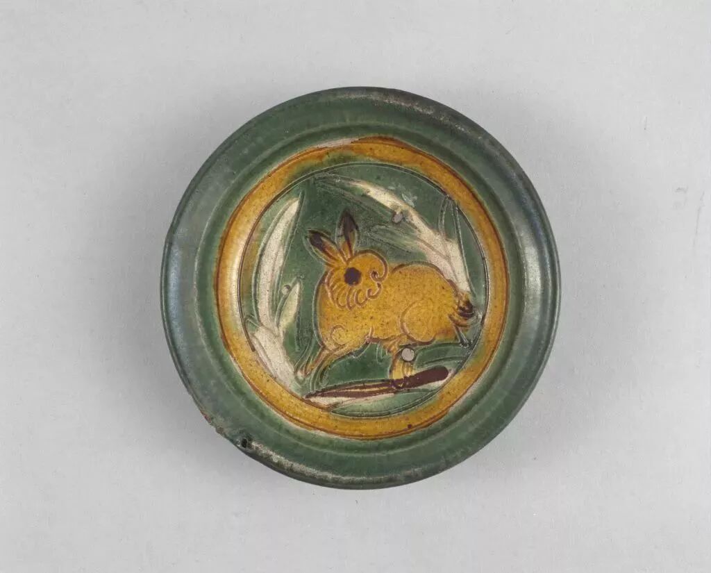 此碟外部、底部均无釉。内底刻划坡地上兔子一只,饰有刻划的花草纹,施以黄、绿、白三彩釉。
