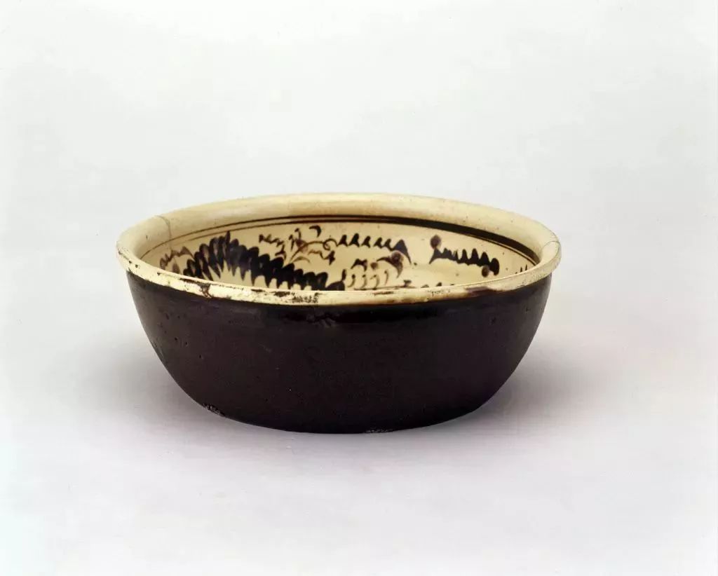 盆外壁尽施黑釉,盆内白底黑花装饰,中心部位勾勒出白兔一只,周围绘花草,形象夸张生动。纹饰丰富而粗率,尽显民窑的粗犷风格。彭城窑位于河北省邯郸市西南,是磁州窑的主要生产窑口之一。其烧造始于宋代,经金、元发展,元末明初进入鼎盛。彭城窑注重瓷器装饰艺术,粗瓷细做。![]()
