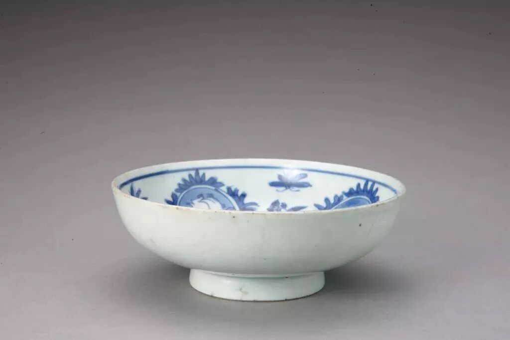这是康熙时期的碗,外壁光素。碗内青花装饰,绘花、蝶、兔等图案。其中最引人注目的是,围绕碗心的花朵内所绘四只白兔,兔回首张望,形态写意。![]()