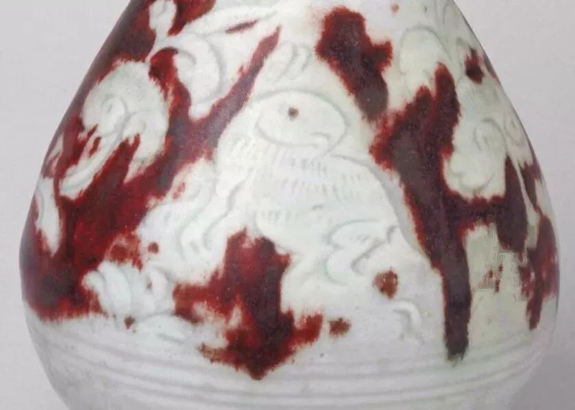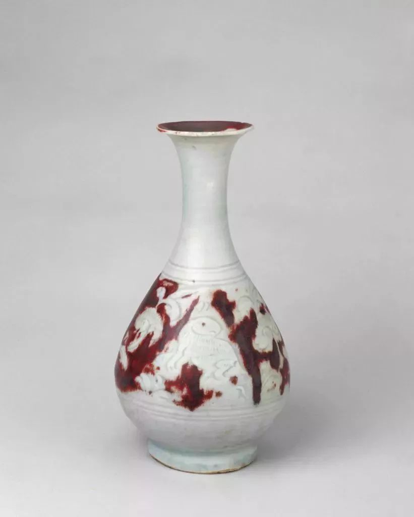 元《釉里红划花兔纹玉壶春瓶》,肩部及腹径最大处各有暗刻弦纹4道,上腹部刻划一只野兔奔跑于花草间,小兔作回首观望状,以釉里红点睛,刻划技法娴熟,刀锋犀利洒脱,线条流畅自然,形象栩栩如生。![]()