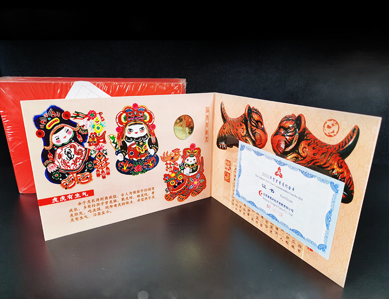 打开封皮,内部卡册封面和外包装一样,不同的在于左上角的开窗,能直接看到虎币的背面:一个娃娃敲着腰鼓,旁边是布老虎,年味知足!