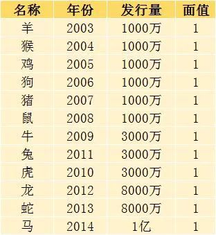 第一轮生肖纪念币从2003年开始发行到2014年结束。比起现在动辄上亿的发行量来说,第一轮生肖纪念币的发行量不算大。![]()