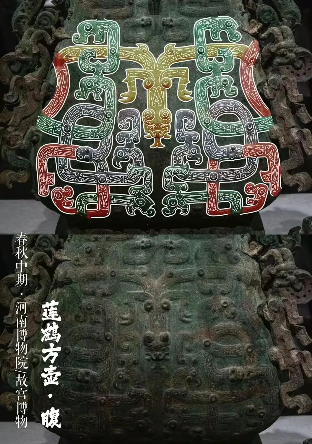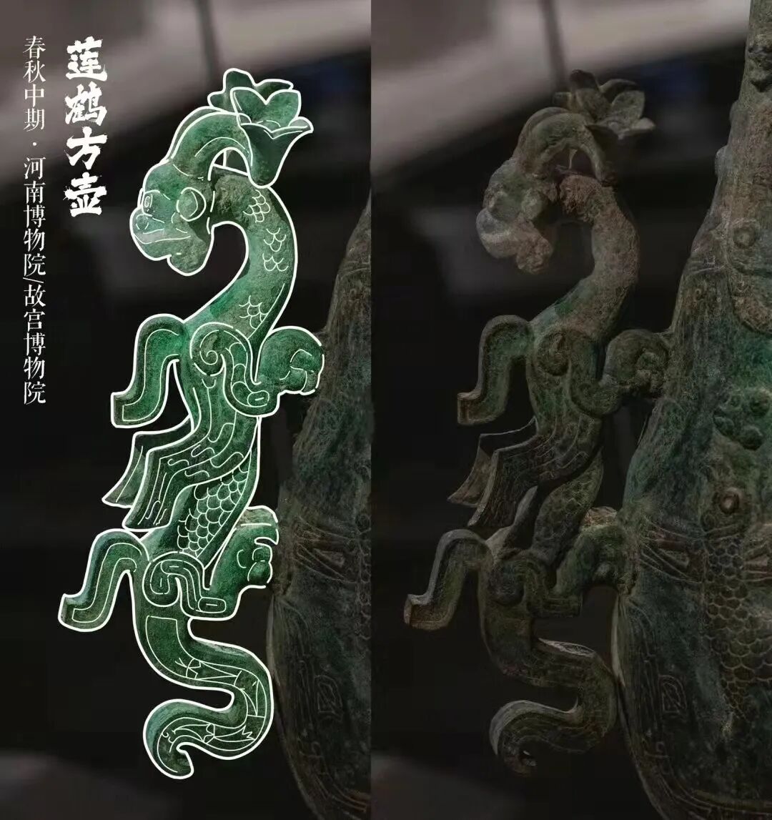河南博物院镇馆之宝——春秋莲鹤方壶,是春秋中期青铜制盛酒或盛水器。莲鹤方壶为一对两件,两壶的主体部分为西周后期流行的方壶造型,有盖、双耳、圈足,重心在下部,器身上附有各种装饰,效果瑰丽异常,反映了春秋时期青铜器艺术审美观念的重要变化。