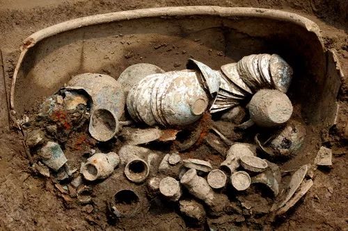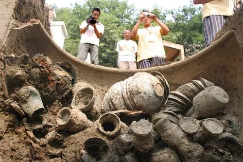 出土的文物之多,出乎记者想象:一口直径约1米、深约0.8米的陶缸被挖成了两半,缸内放置着鼎、钵、杯、盘等工艺复杂的瓷器、铜器,透过部分瓷器上黏附的稀疏黄泥,器身外表的光泽仍非常艳丽。据现场考古工作人员介绍,除了现场的器物外,还有部分出土器物已经被送到了青白江文管所保存,共计200余件。经专家确认,这些器物都是宋朝的文物。更令人吃惊的是,大批宋代文物,竟然是该学校修建化粪池时无意间发现的,“上月底现场施工时突然挖出了一些瓷罐,”遗憾的是,因现场为机械施工,窖藏约二分之一遭到破坏,部分器物也破损严重。