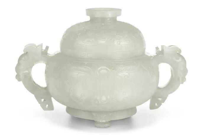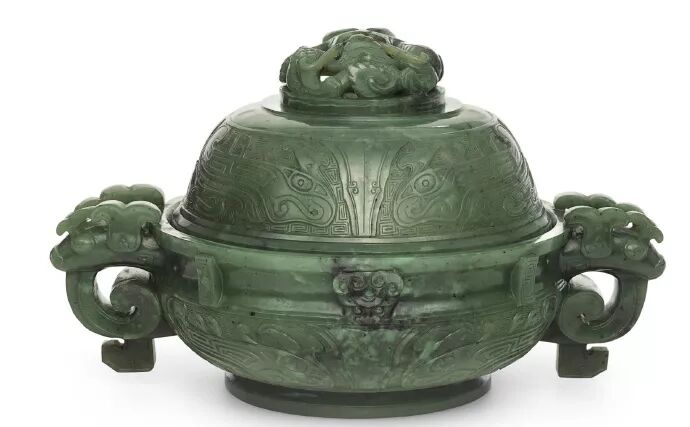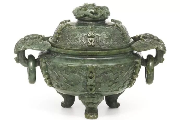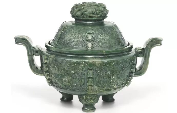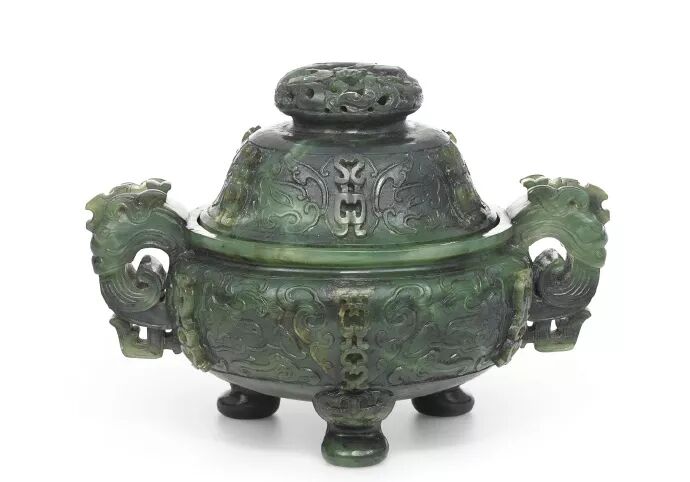 清乾隆 碧玉獸面紋三足蓋爐 16.5 公分 估价:15,000—20,000英镑