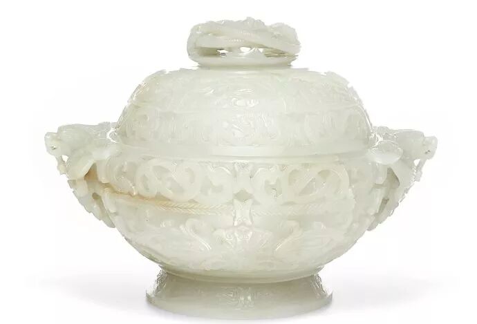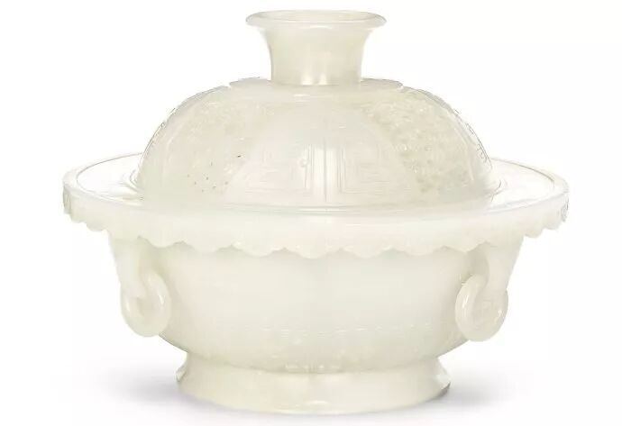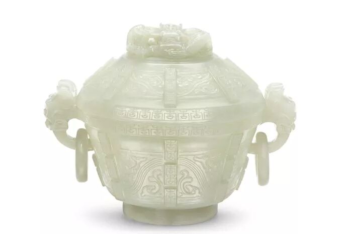 清乾隆 青白玉仿古瑞獸紋雙耳活環蓋盌 14.6 公分 估价: