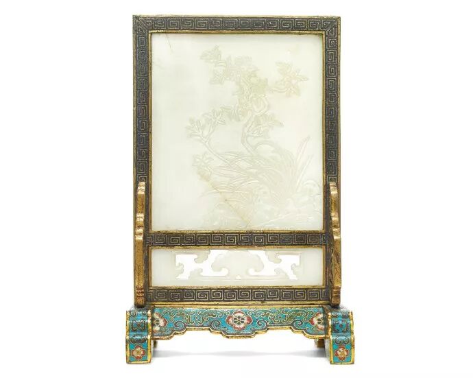 清十八/十九世紀 青白玉花果紋插屏 鑲銅胎掐絲琺瑯座 25 公分 估价: