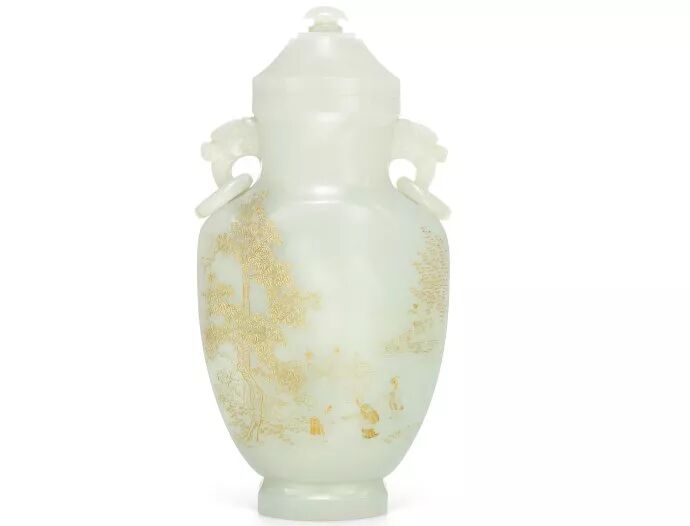 清十八/十九世紀 青白玉暗刻描金高士賞遊圖蓋瓶 27.7 公分 估价: