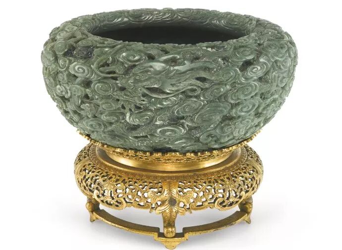 清乾隆 碧玉穿雲游龍紋缽 配銅鎏金座 18.5 公分 估价: