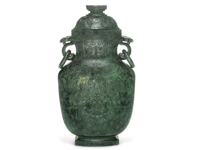 清十九世紀 碧玉纏枝蓮紋如意耳活環蓋瓶 23.5 公分 估价:20,000—30,000英镑