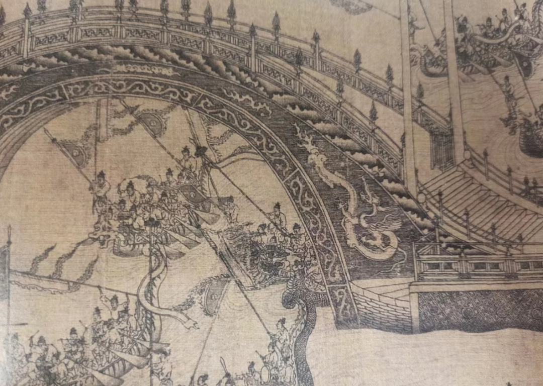 除了表现人们的日常生活,风俗画还重视时令、节候的表现。比较古代是农业社会,农业生产依靠对于天时、气候的认识。那当然是在金明池上,举办一场盛大的皇家龙舟夺标赛。画面中,一艘雕梁画栋、造型夸张的龙舟,在众多小船的“众星捧月”下浩荡前行。在唐代,龙舟竞渡以终点夺取锦标裁定胜负,夺标也由此成为了获胜的代名词。古人认为农历五月是恶月、毒月。五月阳气至盛,但阴气也开始生长,因此有很多去除不详的风俗:采草药、悬艾人、观竞渡等。一些习俗传承至今,成为现代端午节的重要活动,比如赛龙舟和看龙舟。比如,在家门口悬挂艾草和菖蒲,驱除蚊虫、净化空气。画面中,6人有3个是幼儿,大人带着小孩一起来包粽子,美好的传统就是要一代一代传下来。斗草,分“文斗”和“武斗”。下面这帮娃娃正在文斗,文斗就是对花草名,以对仗的形式互报草名,谁采的草种多,对仗的水平高,谁就赢。武斗,就是双方先各自采摘具有韧性的草,然后相互交叉成“十”字并用劲拉扯,不断的为胜。下面这两个娃娃就在武斗,瞧瞧这认真劲,眼睛都斗鸡眼了!冬季,万物萧条,山茶、梅花却凌寒盛开。对于小娃子来说,这是一个信号,放鞭炮的季节来咯!大傩,是腊月举行的去除疫鬼和寒气的,画里展示的是娃娃戴着老人、老妪面具舞大傩的场面,装扮奇特,动作滑稽。