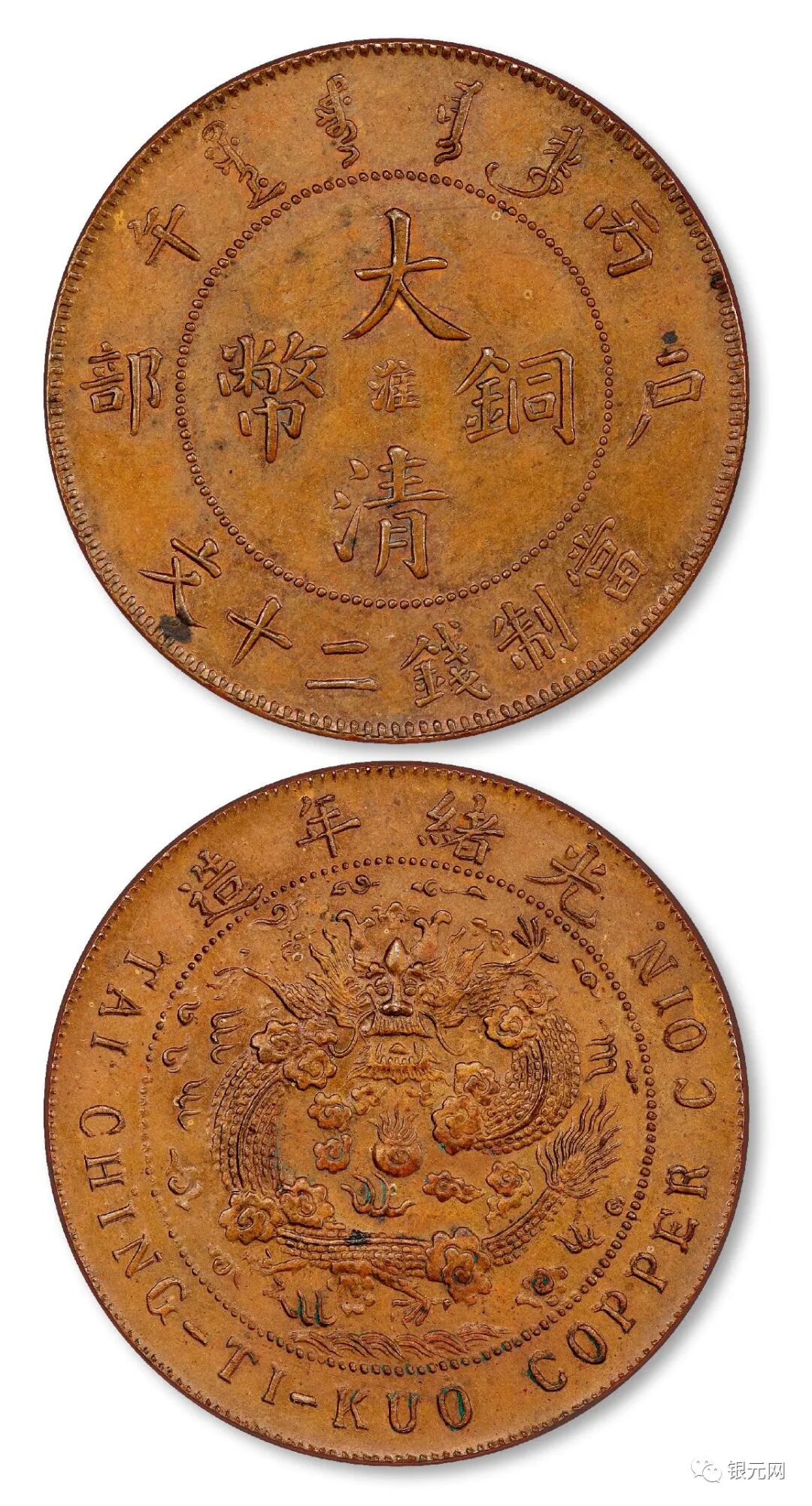 纪录:2018年4月2、5日SBP公司香港“鲍尔斯家族集藏中国铜币”专场拍卖会,目录封底拍卖品第40201号,成交价:50.4万美元,与同场封面拍卖品四川当三十水龙红铜样币并列该场成交价冠军