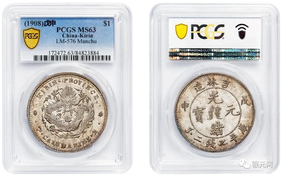 1908年戊申吉林造光绪元宝中心满文库平七钱二分银币一枚,Y-183b/LM-576,币面中心满文直译为“大清国”,系吉林干支年号系列银币中最为珍稀的品种之一,铸额极少;此币铸造时间短暂,制成后大多进入市面流通,因此,所见存世品通常品相不佳,或币面磨损,或打有戳印,版底无伤、龙鳞清晰、银光姣好者如凤毛麟角,因此,老一辈藏家对吉林戊申花篮、戊申满文二种银币的品相要求普遍不高,币面无戳印者即为佳品;拍品铸打极为卓越,底版细腻无痕,光亮如镜,铭文书法遒劲隽挺,龙鳞锋刃,包浆轻薄均匀,银光通透,其状态非一般吉林系列银币所能比拟,轶类超群,令人一见倾心;目前所见,经PCGS评鉴入盒的戊申花篮和满文两大最珍罕版式银币中,唯有此一品原光未流通状态可达BU等级,堪称吉林省铸币顶级珍品,PCGS MS63,目前以高于第二名3分的绝对优势,遥遥领先于该公司评级榜单之首位
