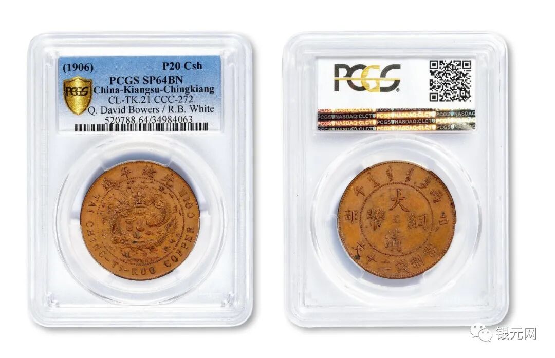 1906年丙午户部大清铜币中心“淮”二十文样币一枚,CCC-272/CL-TK.21,清江浦铜元局仅量产了“阴淮”与“阳淮”十文铜币,二十文面值者目前虽已知四枚存世,但因缺乏史料佐证,业内研究推测认为,应属试样或短期搭造性质;在存世的四枚“淮”二十文当中,仅两枚品相可达完全未使用一级,拍品即其中之一,另枚则由著名收藏家孙鼎捐赠入藏上海博物馆,余二枚则为流通品相,故“淮”二十文铜币存世可谓稀若星凤,被列中国近代机制铜币十大名珍;拍品系钢模初打,底版无伤,图文压印饱满清晰,细节处无一不精,颇具样币风范;同时,此样币出身名门,传承有绪,在2018年4月香港SBP钱币拍卖会上,以50.4万美元的成交价,与同场拍品四川当三十水龙红铜样币并称拜伦·怀特(R.Byron White)集藏之“绝代双骄”,珍贵之至,PCGS SP64BN,目前为该公司此品种唯一入盒纪录