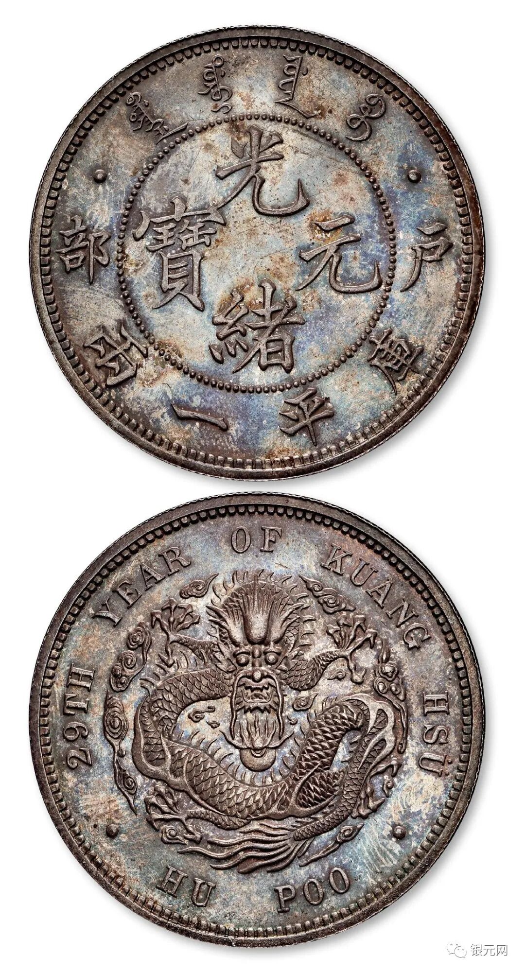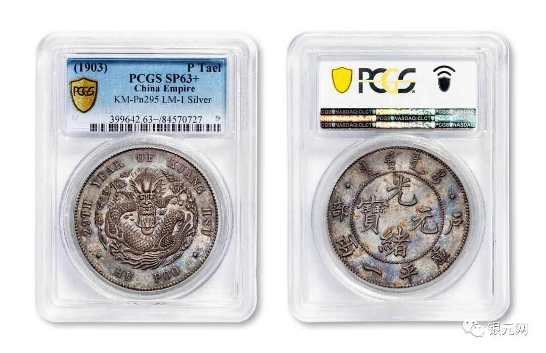 光绪二十九年户部光绪元宝库平一两银币样币一枚,K-927a/LM-1,“入”两版,日本大阪造币局制模,北洋银元局试铸,泉界习称“户部一两”,是中国近代铸币史上尺寸最大的机制龙银;当时因清政府的“圆两之争”,币制悬而未定,最终并未发行,传世仅有少量样币,近代藏家将其与北洋一两、上海壹两并称“三两银”,得以庋藏方可晋阶高端藏家行列;样币以镜面版底精铸,模具雕刻极尽精美,钢模初打之下压力十足,内齿凌厉整饬,字口锋利劲拔,龙图头角饱满,鳞甲锋刃,制作拔萃超群;虽经岁月沉淀,币面呈深灰色包浆,但依然光泽充沛,浮现出的紫罗兰色瑰丽彩光,动人心弦,PCGS SP63+,目前为该公司“入”两版样币评级榜单亚军分