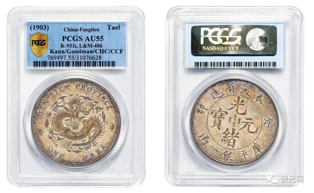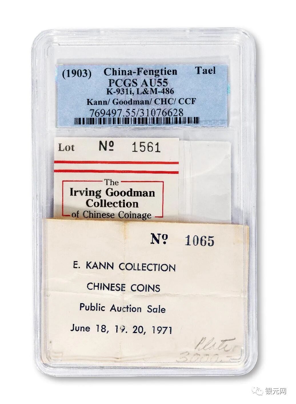1903年癸卯奉天省造光绪元宝库平银一两银币样币一枚,K-931I/LM-486,奉天制造银圆总局雕模试铸,泉界习称“奉天一两”,彼时因“圆两之争”币制未决,仅试铸未发行;奉天一两样币自光绪三十年(1904)首次见诸公开报导为世人所知,距今近一百二十年孑然一品,遗世独存,毫无疑问位居中国机制币大珍之首;样币雕刻工谨,铸模深峻,底版银光莹亮,颇具类镜面观感,虽设计风格与同时期量产的“圆”制奉天七钱二分银币相类似,但币文楷书更为瘦硬有神,龙身更加粗壮威武,气势恢宏,见之忘俗;此样币收录于国内外多种机制币权威目录,出版繁多,著录累累;拍品1952年在香港出现,张璜以拓图经马定祥鉴定为真品后,2000美元售与著名收藏家耿爱德(E.Kann),1971年耿爱德藏中国钱币拍卖会上,被美国富商古德曼(Irving Goodman)以3000美元收入囊中,1991年古德曼藏中国钱币付诸拍场,资深钱币收藏家张秀青以18.7万美元竞得,创其时中国钱币最高成交纪录,2010年,上海收藏家周大为斥巨资,将其捧回故里,正是这些顶级藏家的薪火相传,让此枚绝世遗珍不坠生死轮回,与日月同辉,PCGS AU55;另附PCGS封装耿爱德、古德曼专场拍卖会展签