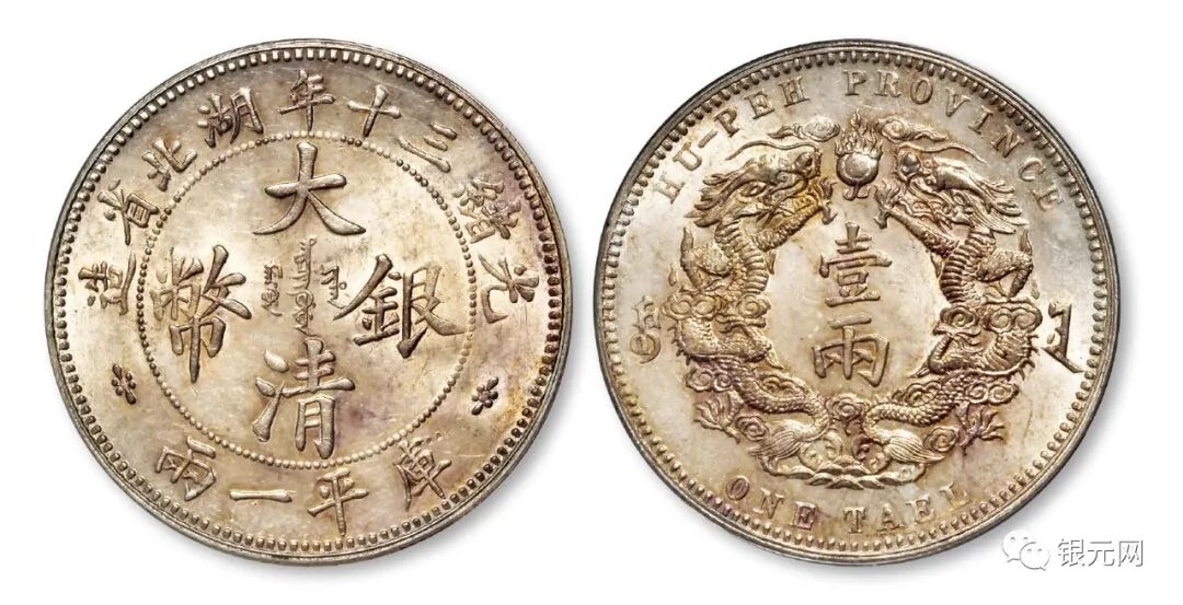 光绪三十年八月(1904年9月),湖广总督张之洞奏请在湖北试制一两银币获准。十二月初一(1905年1月6日),湖北银元局改名为银币局,开始制造新银币,模具由日本大阪造币厂制作。此俗称“湖北壹两”的银币,是中国最早在币面上铭文“大清银币”的,也是流通币中,除吉林“厂平壹两”外唯一的“两”制币。“湖北壹两”推行并不成功,失败原因主要是相异于原本通行的七钱二分银币形制,使用不便。其次,各地平法不一,仍然要相互折算才能通行。再说成色也是问题,英国驻汉口商务领事报告指出:因为成色只有87.7%,比同等重量的七钱二分银元含银量低,故不受商民欢迎。产量方面亦有不同说法,据宣统元年《东方杂志》第八期记载:“张之洞试铸库平一两银元数十万,分给湖南,退还未用;湖北本省,除发委员薪水外,均未行用,旋即停铸,仍铸七钱二分。”存世的“湖北壹两”银币,依正面中央铭文“大清银币”四字的大小,可分为大字、小字两版,以前者更为罕见。—摘自孙浩编著《百年银圆》,上海科学技术出版社,2012年,页14。