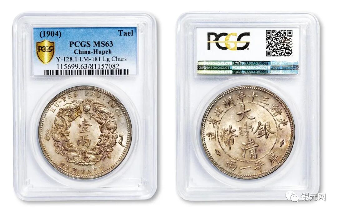 光绪三十年湖北省造大清银币库平一两一枚,Y-128.1/LM-181,大字版,短暂发行后收回,存世较小字版更为少见;拍品版模深峻,龙身高高跃出版面,字口平正凸立,制作精良,币面呈悦目香槟色包浆,银光充沛,品相极其难得,PCGS MS63
