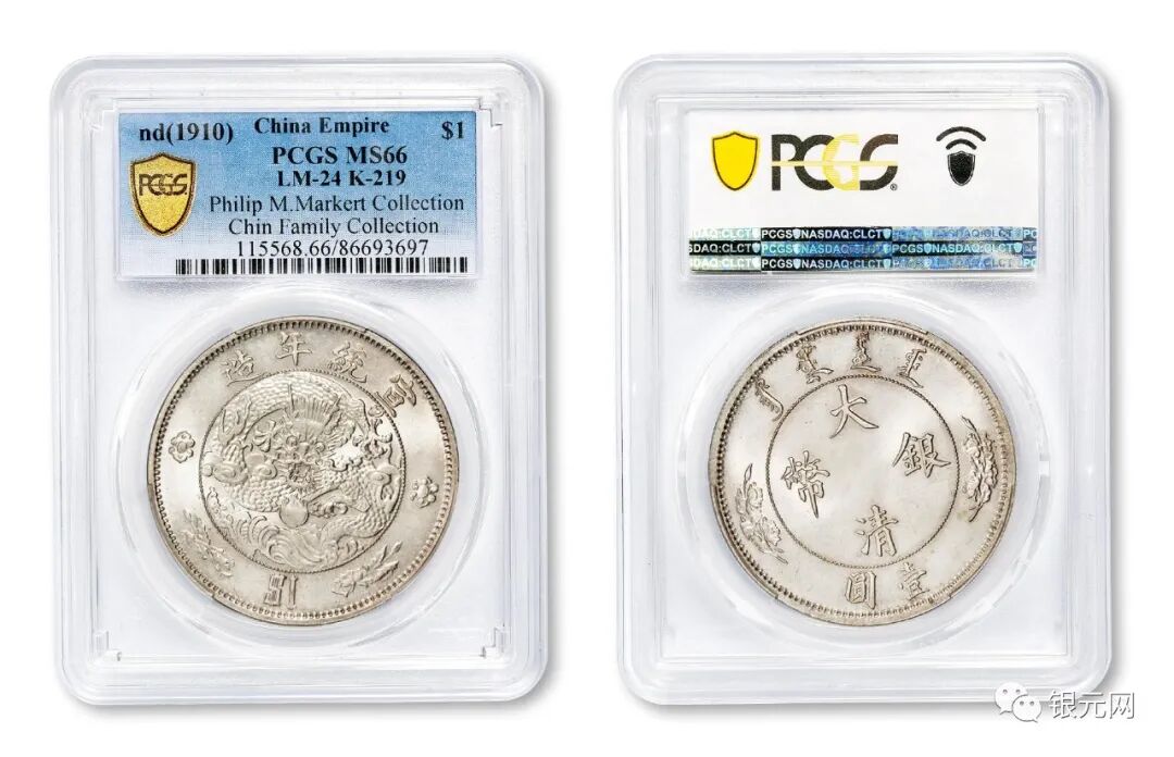 宣统年造大清银币壹圆“$1”一枚,K-219/LM-24,奥地利维也纳造币厂设计制模,1910年度支部天津造币总厂铸造,小批量生产并未发行;拍品系钢模初打,高边郭,内齿锋利,图文深峻精美,缎面版底细腻无痕,满溢亮泽车轮原光,其品相于水龙系列银币堪称翘楚,PCGS MS66,目前以唯一最高分,独霸该公司评级纪录之榜首