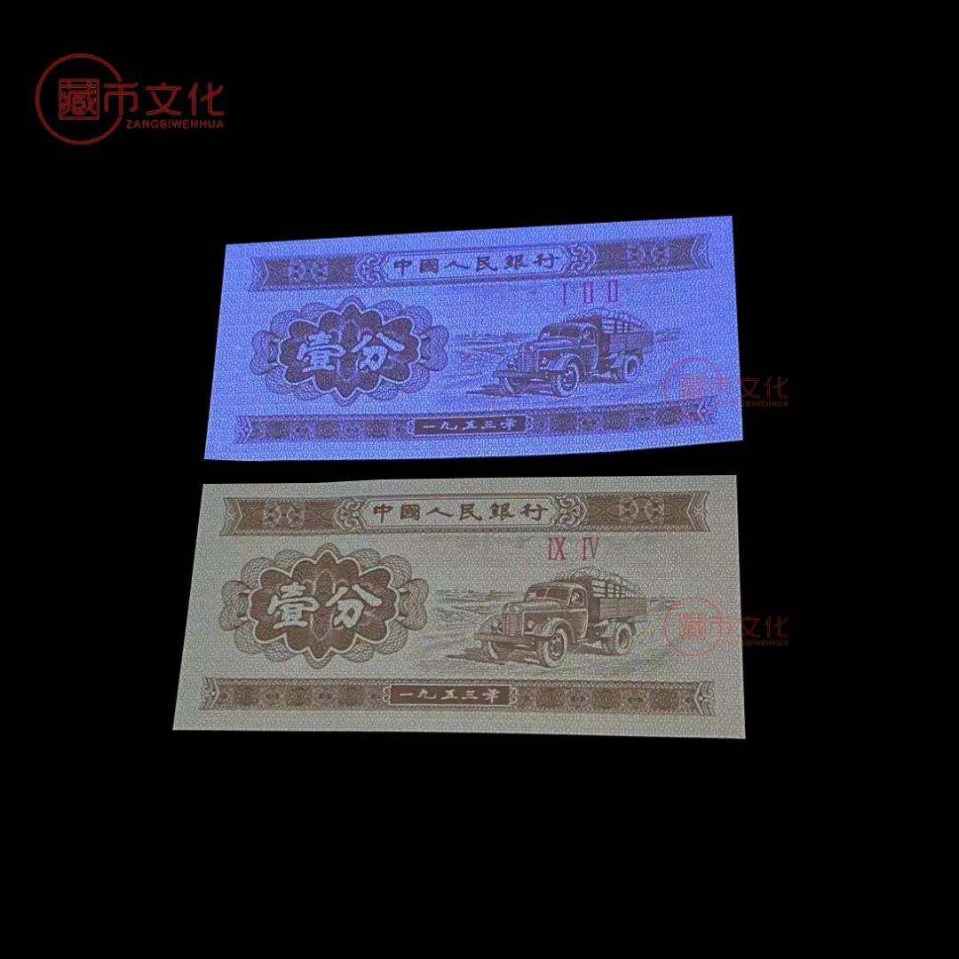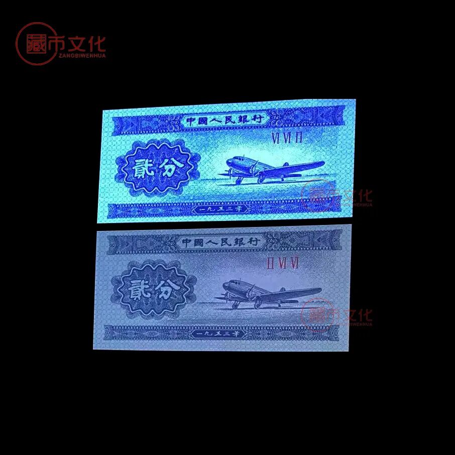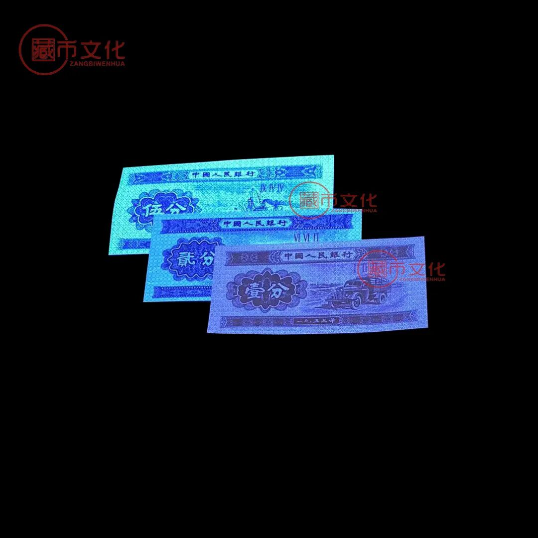 1分纸币在紫光灯下看得不是很明显,但是一经对比,效果就非常明显了,荧光色偏白,有个好听的名字,叫黄金满屋。5分纸币的荧光效果是最好的,不需要对比也可以看得出来荧光效果那是杠杠滴!注意:大家在使用荧光灯的时候,可以用普通的纸分币进行对比,照片中显示的荧光效果,因为照相机与紫光灯瓦数的区别,会有所影响。