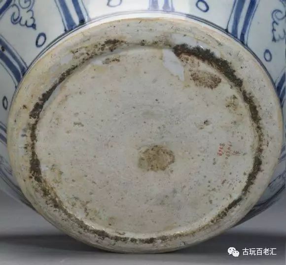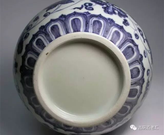 7、胎骨(底足)洪武前颗粒较粗,胎大多呈白中泛灰,胎骨有小孔隙,而永乐后胎骨相对比以前的要细白一些,无论胎质怎样,看上去绝不生硬,有自然熟透感,使人感到胎质粗细不干燥,有无氧化物都自然,手感不重又不扎的那种润腻不涩的胎质感。