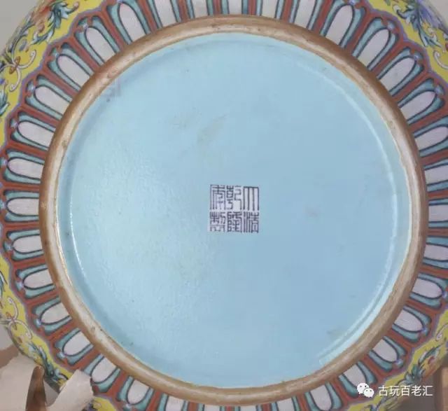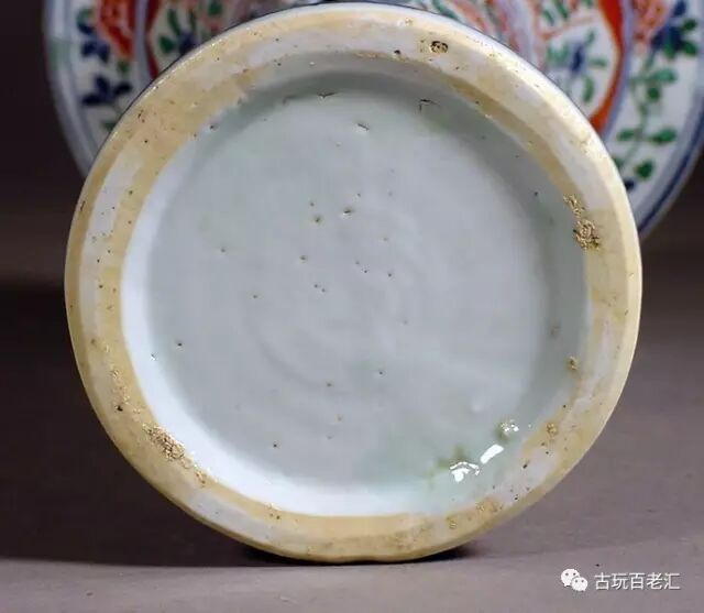 14、护胎釉通常添加芝麻色的植物灰,可以保护素胎,便于均匀上釉。乾隆和现代伪作天球瓶的圈足处护胎釉差别很大,乾隆的护胎釉经过高温氧化,闪闪发亮,而赝品根本不见有芝麻色护胎釉。