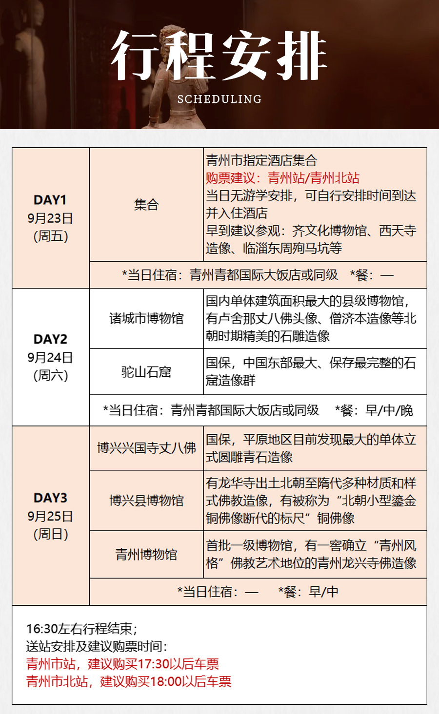 精心设计的独家路线:线路原创,由深耕文化游学5年的资深团队精心设计,在青州博物馆升级闭馆前,利用周末时间,一次性遍览青州及其周边主要佛造像博物馆,开启一场独特的青州造像艺术与佛教美术之旅。