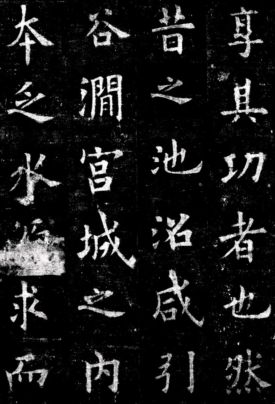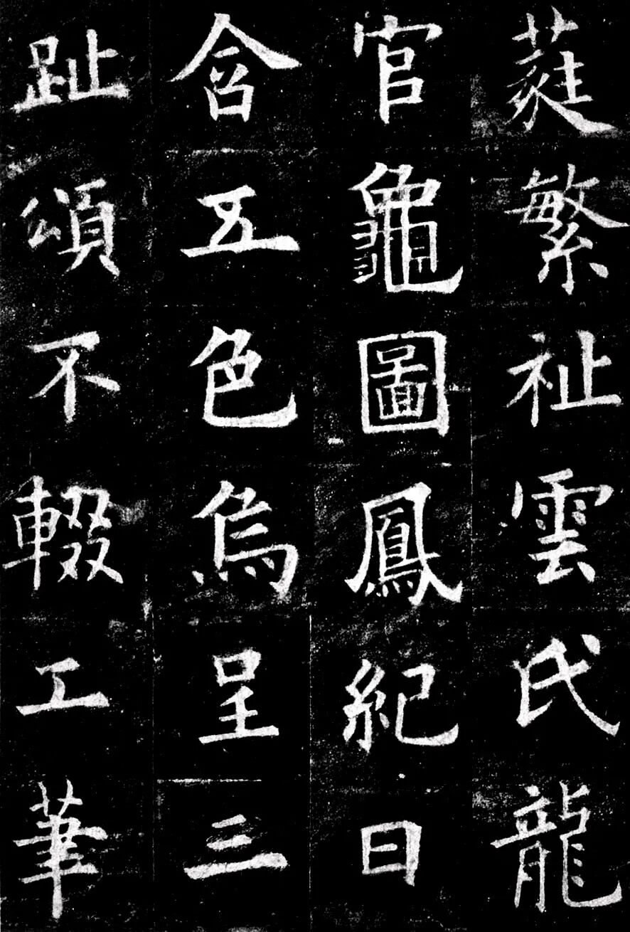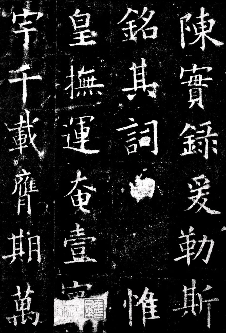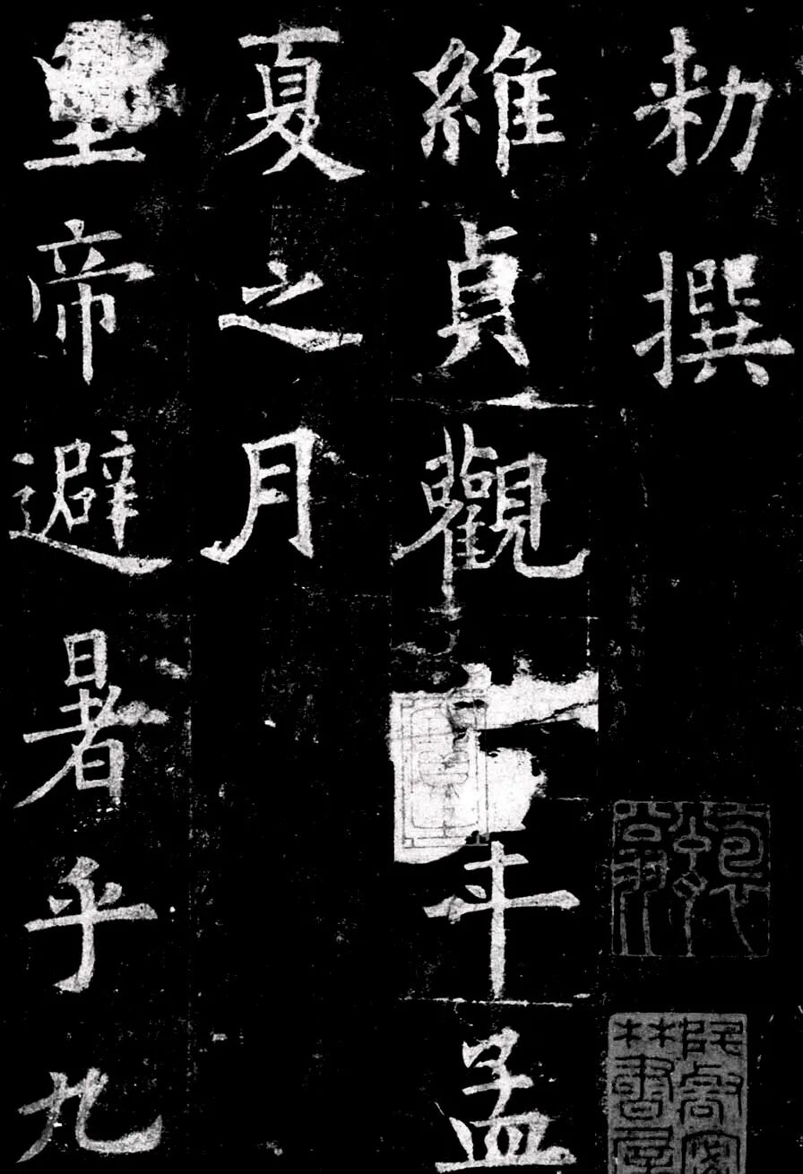 唯皇抚运,奄壹寰宇,千载膺期,万物斯睹,功高大舜,勤深伯禹,绝后承前,登三迈五。握机蹈矩,乃圣乃神,武克祸乱,文怀远人,书契未纪,开辟不臣,冠冕并袭,琛贽咸陈。大道无名,上德不德,玄功潜运,几深莫测,凿井而饮,耕田而食,靡谢天功,安知帝力。上天之载,无臭无声,万类资始,品物流形,随感变质,应德效灵,介焉如响,赫赫明明。杂沓景福,葳蕤繁祉,云氏龙官,龟图凤纪,日含五色,乌呈三趾,颂不辍工,笔无停史。上善降祥,上智斯悦,流谦润下,潺湲皎洁,萍旨醴甘,冰凝镜澈,用之日新,挹之无竭。道随时泰,庆与泉流,我后夕惕,虽休弗休,居崇茅宇,乐不般游,黄屋非贵,天下为忧。人玩其华,我取其实,还淳反本,代文以质,居高思坠,持满戒溢,念兹在兹,永保贞吉。兼太子率更令勃海男臣欧阳询奉敕书。