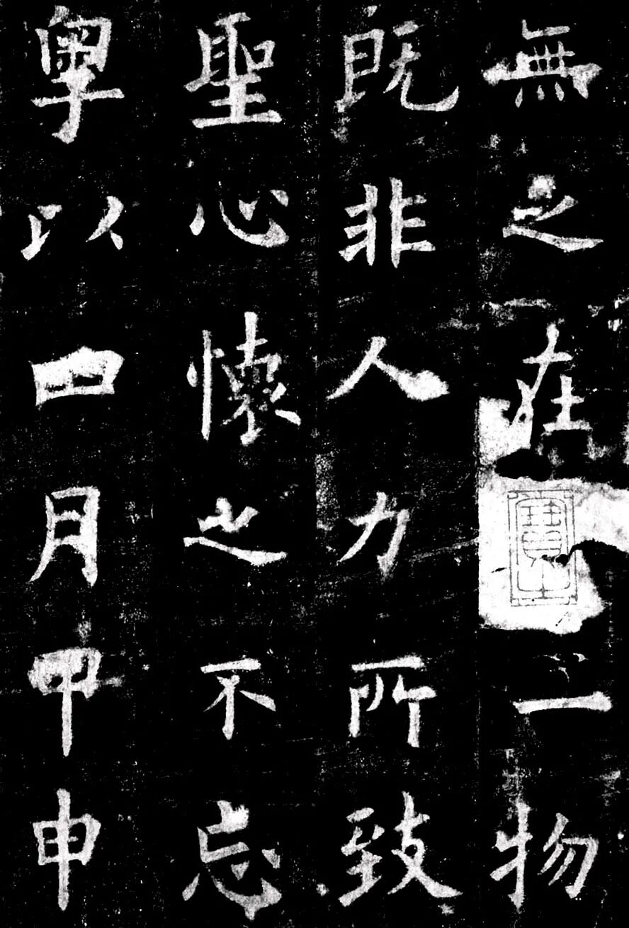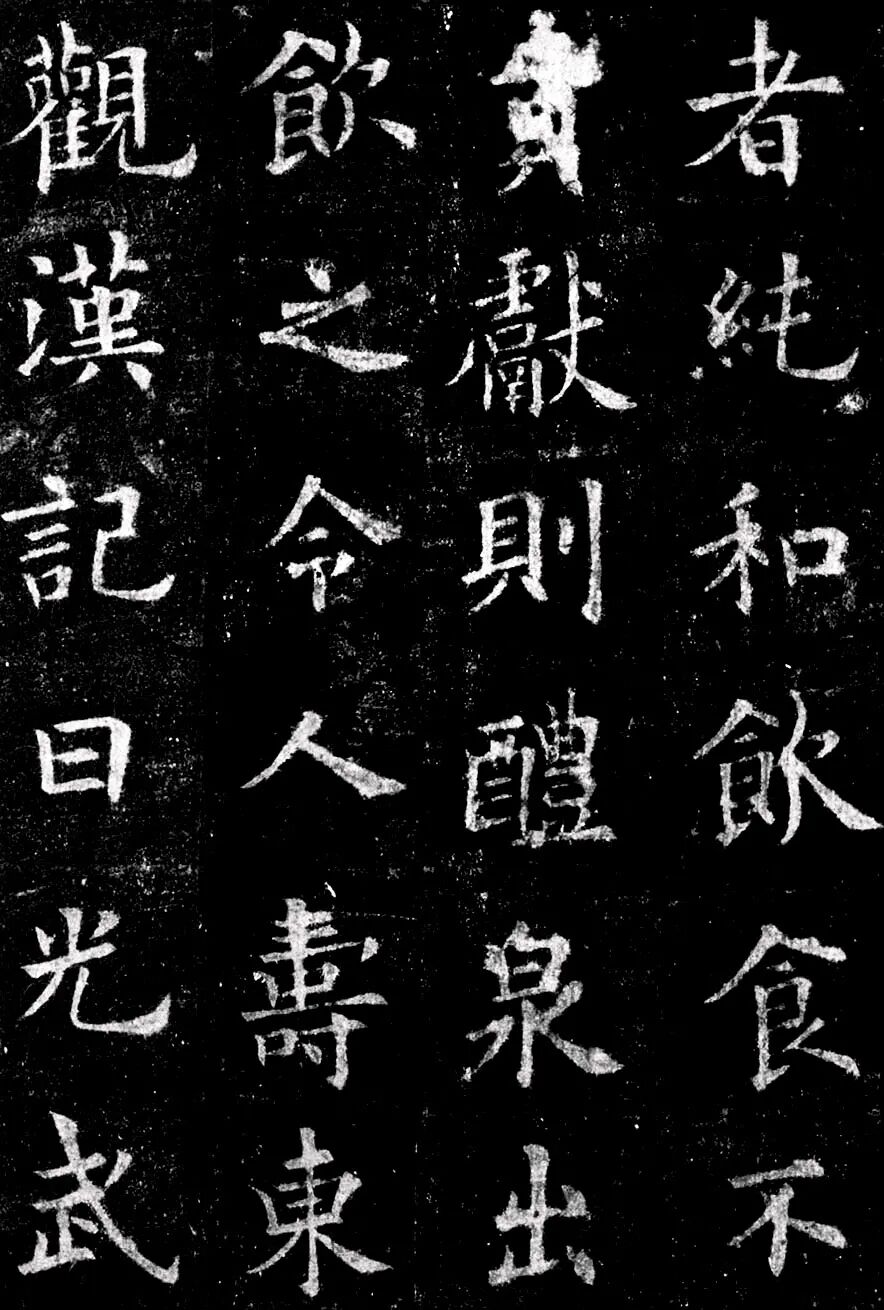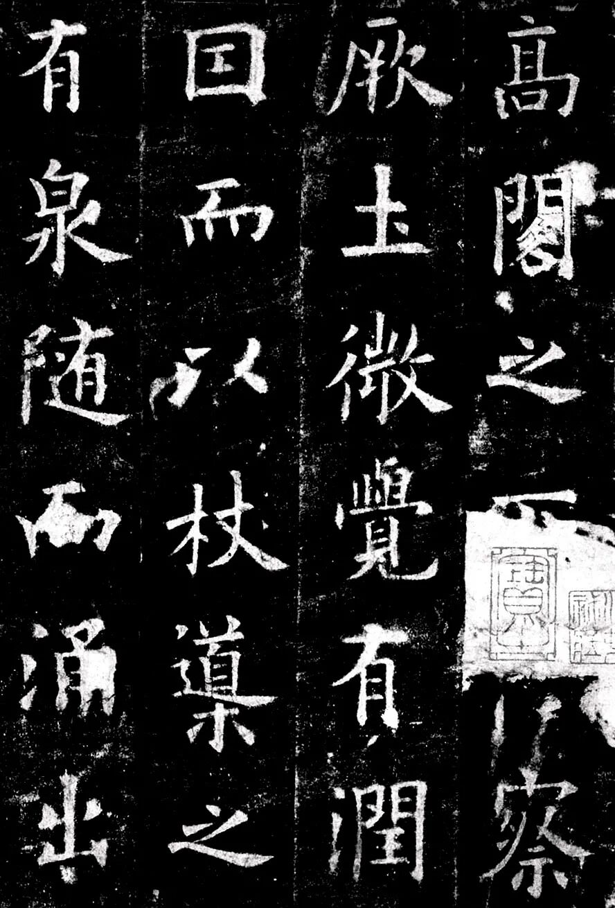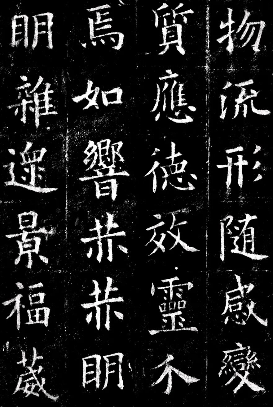 唯皇抚运,奄壹寰宇,千载膺期,万物斯睹,功高大舜,勤深伯禹,绝后承前,登三迈五。握机蹈矩,乃圣乃神,武克祸乱,文怀远人,书契未纪,开辟不臣,冠冕并袭,琛贽咸陈。大道无名,上德不德,玄功潜运,几深莫测,凿井而饮,耕田而食,靡谢天功,安知帝力。上天之载,无臭无声,万类资始,品物流形,随感变质,应德效灵,介焉如响,赫赫明明。杂沓景福,葳蕤繁祉,云氏龙官,龟图凤纪,日含五色,乌呈三趾,颂不辍工,笔无停史。上善降祥,上智斯悦,流谦润下,潺湲皎洁,萍旨醴甘,冰凝镜澈,用之日新,挹之无竭。道随时泰,庆与泉流,我后夕惕,虽休弗休,居崇茅宇,乐不般游,黄屋非贵,天下为忧。人玩其华,我取其实,还淳反本,代文以质,居高思坠,持满戒溢,念兹在兹,永保贞吉。兼太子率更令勃海男臣欧阳询奉敕书。