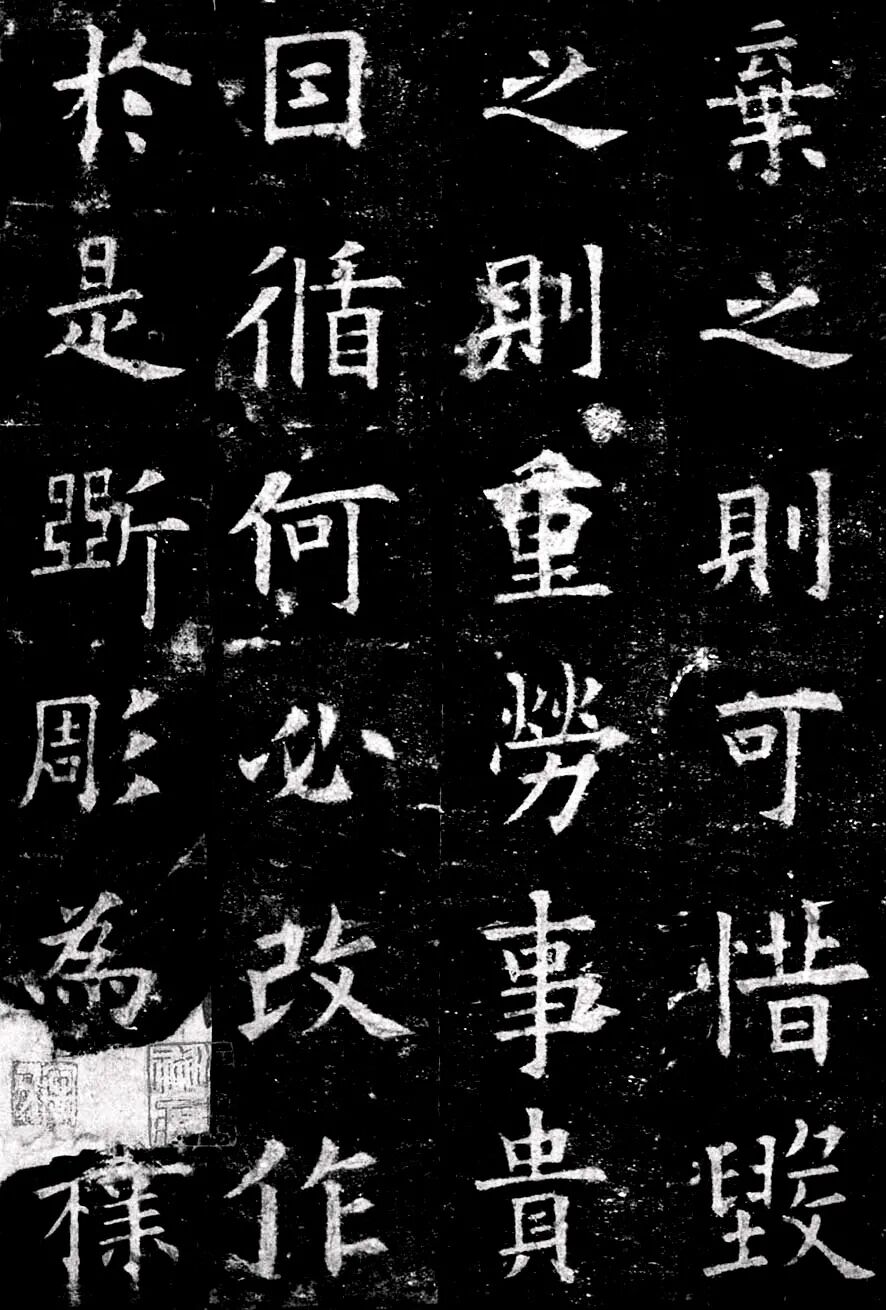 它的点画风格主要有三个:瘦硬、秀丽、温润。这三者不是截然分开的,而是在一笔或一字之内同时表现出这些风格。它的结字有三个特点:第一个特点是平正,平正与端庄意思差不多,是篆书、隶书、楷书等静态书体的共同特点。第二个特点是紧结,即内紧外松或内密外疏。笔画往中宫靠拢,向四周放射,也称为辐射性结体。第三个特点是纵长。有行有列、大小适中且一致、体重相等可以说是《九成宫醴泉铭》章法成功的基础。被后世誉为“天下第一楷书”或“天下第一正书”。