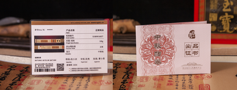 盒内证书齐全,出品证书、贵金属检测证书一应俱全,都在证明着《中秋帖》金渲彩绘银卷的品质值得信赖,无可争议。